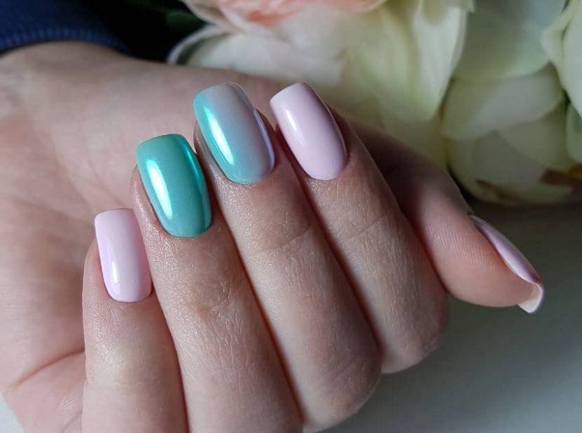 Самыми популярными зеркальными пигментами являются золотой и серебряный. Для жемчужного эффекта выбирают светлые оттенки. Тем, кто хочет получить насыщенный дизайн, лучше применять темный гель-лак в качестве основы. Для создания более нежного образа остановитесь на пастельных оттенках.