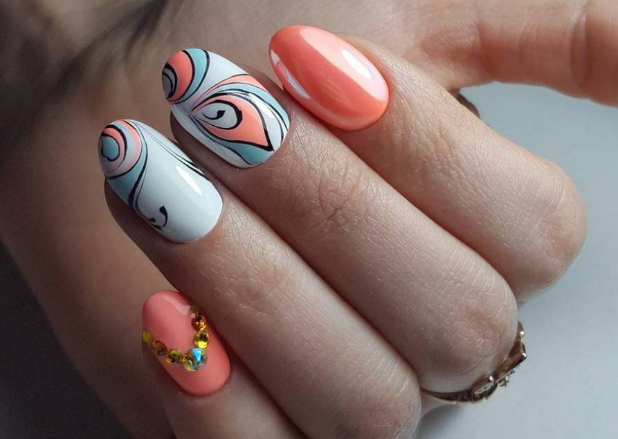 Здесь вам также не понадобятся дополнительные украшения. Можно скомбинировать расцветку с лаками белого и прозрачного цвета, выполнив тот или иной геометрический рисунок.
