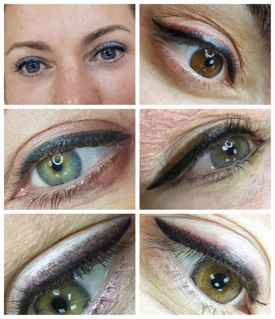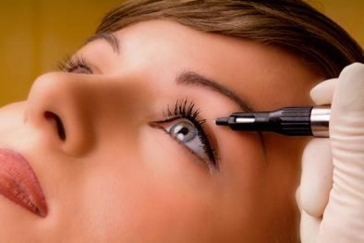 - Теперь приступают к нанесению татуажа глаз. Первая линия обработки — контур роста ресниц. Затем площадь обработки увеличивается и наносятся стрелки. Если нужно сделать растушевку, специалист создает видимость напыления, вводя пигмент в разные точки кожи.