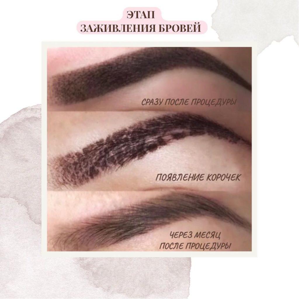 Заживают брови после пудровой техники в течение 1 месяца, но уже по истечении первой недели, припухлость и отек сойдут, но останется корочка. Корочку нельзя сдирать, а нужно лишь смазывает ее с помощью кремов и мази.