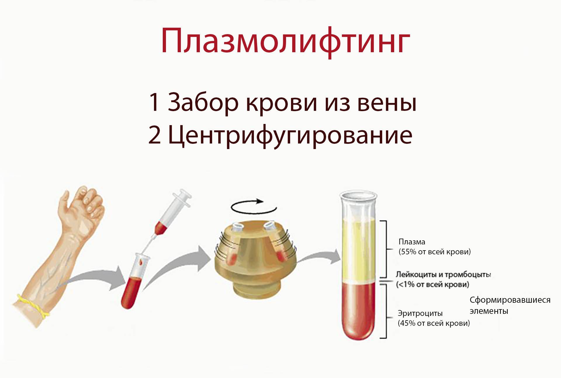 Забор венозной крови и получение препарата путем обработки биоматериала в центрифуге. Врач берет кровь, затем отделяет обогащенную плазму, которая будет использоваться для инъекций;