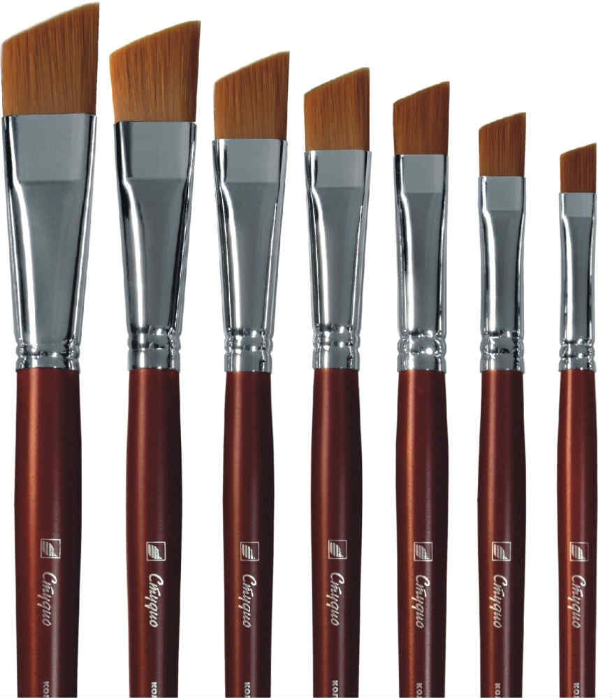 - ретушные кисти из-за характерного скошенного под углом пучка, называют скошенными. Обычно они используются для эскизов и набросков, поскольку линии, проведенными ими, получаются очень четкими с очерченными углами. Также они нужны для рисования точных мазков в труднодоступных местах работы;