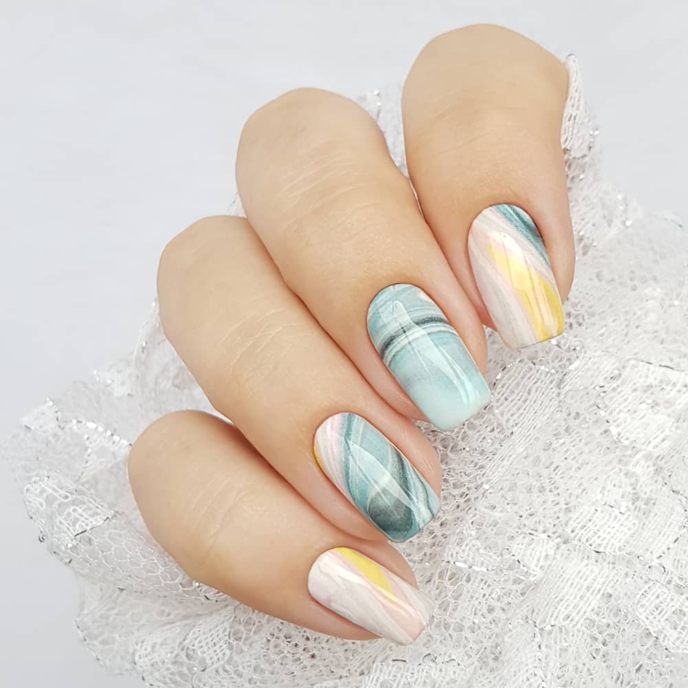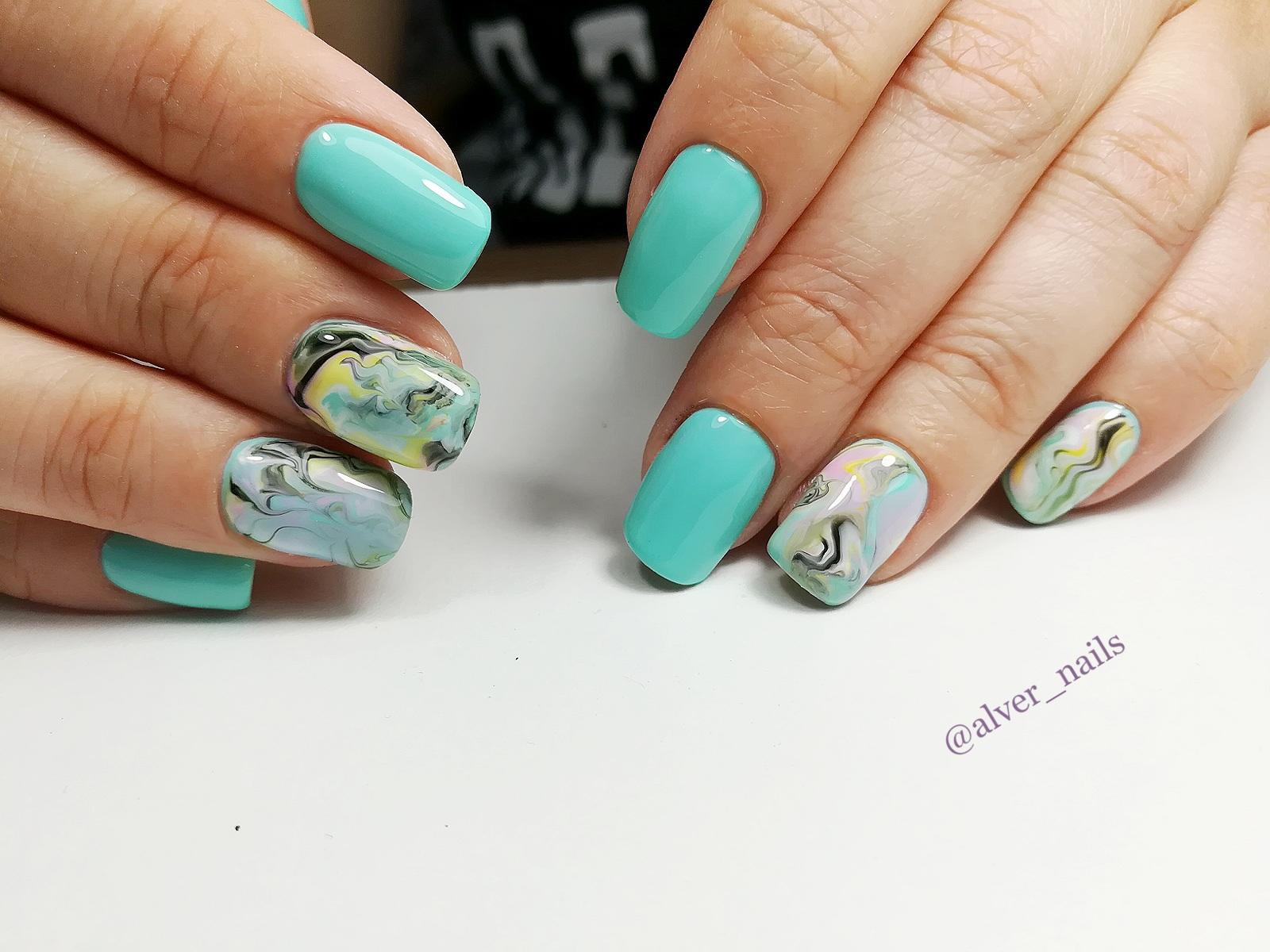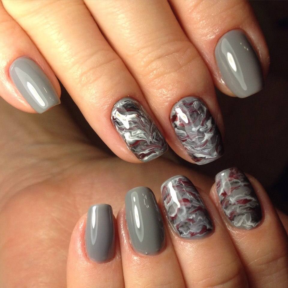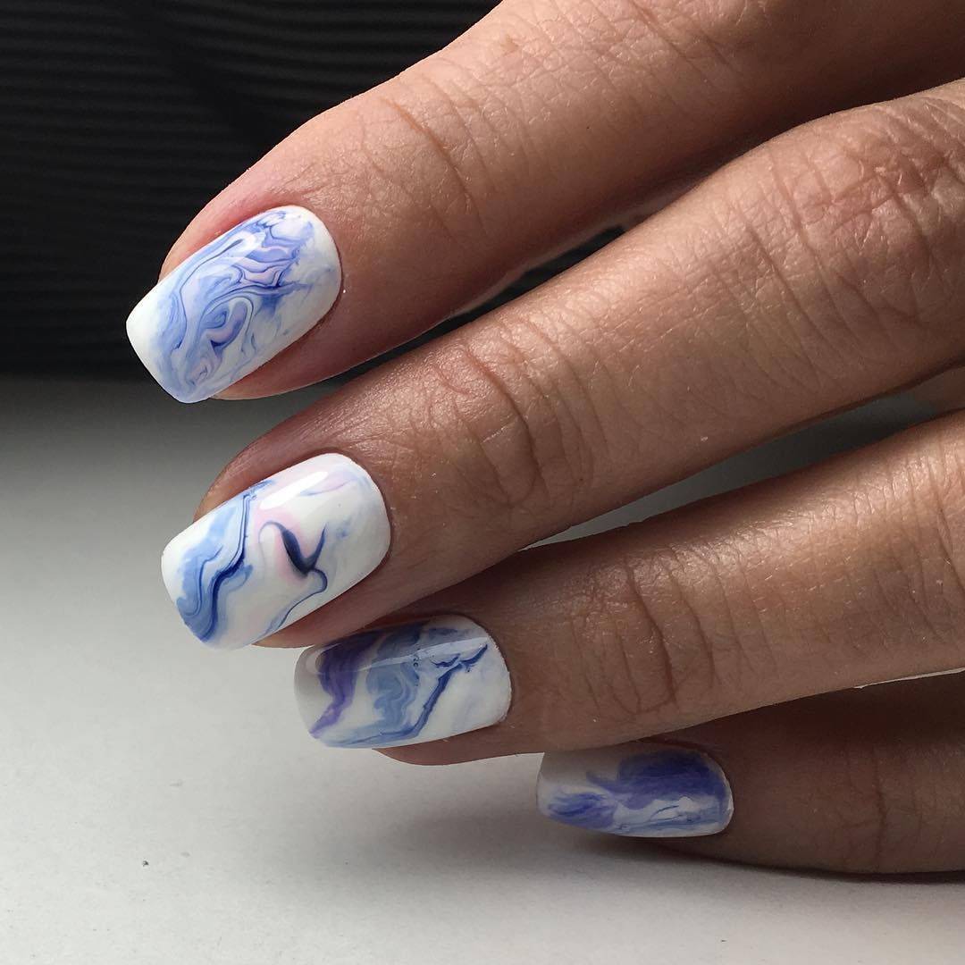 Выбирать цвета для мраморного маникюра можно по настроению: более приближенным, похожим на натуральный камень является белый мрамор, но также подходят бежевый, серый оттенок. Но можно экспериментировать и с другими цветовыми комбинациями: розовым, черным, персиковым, коричневым цветами.