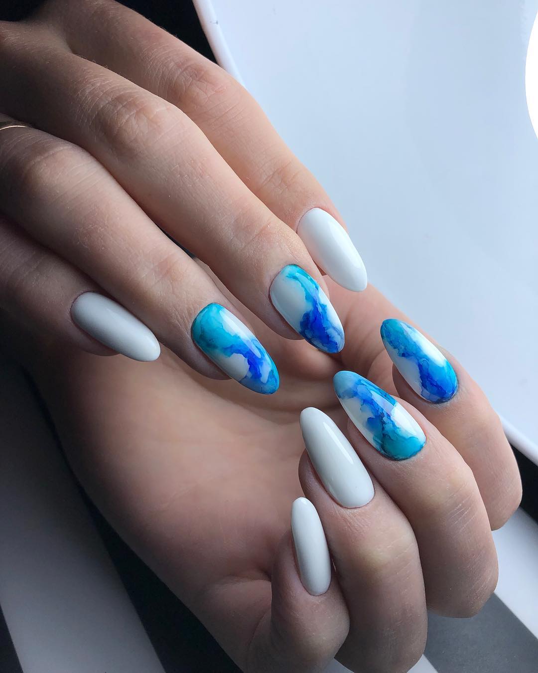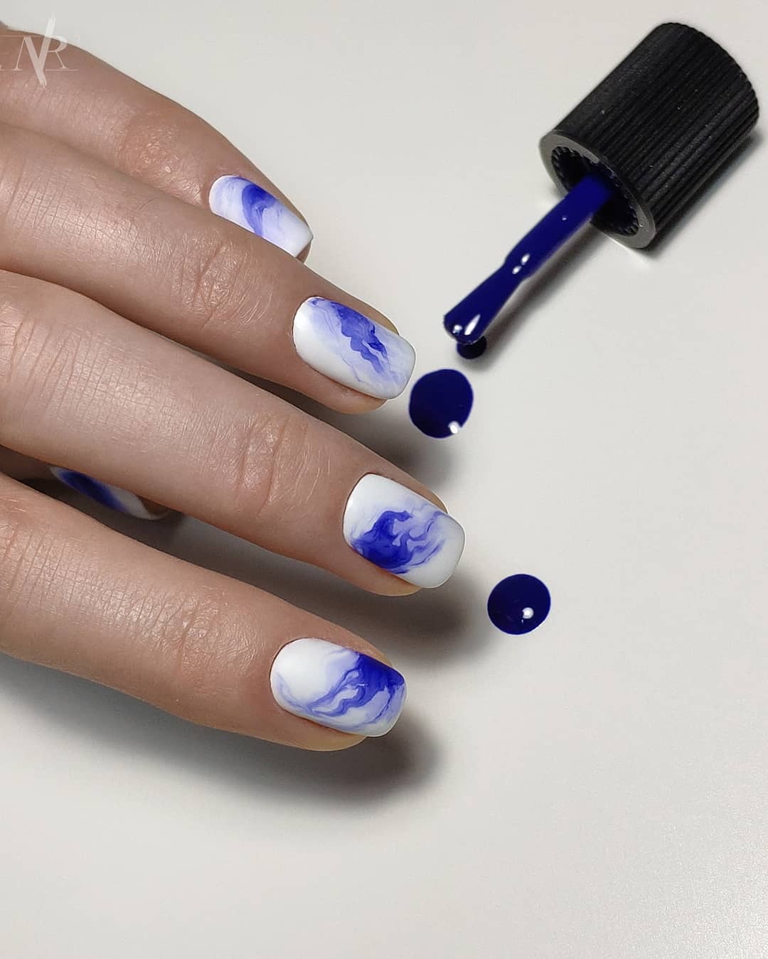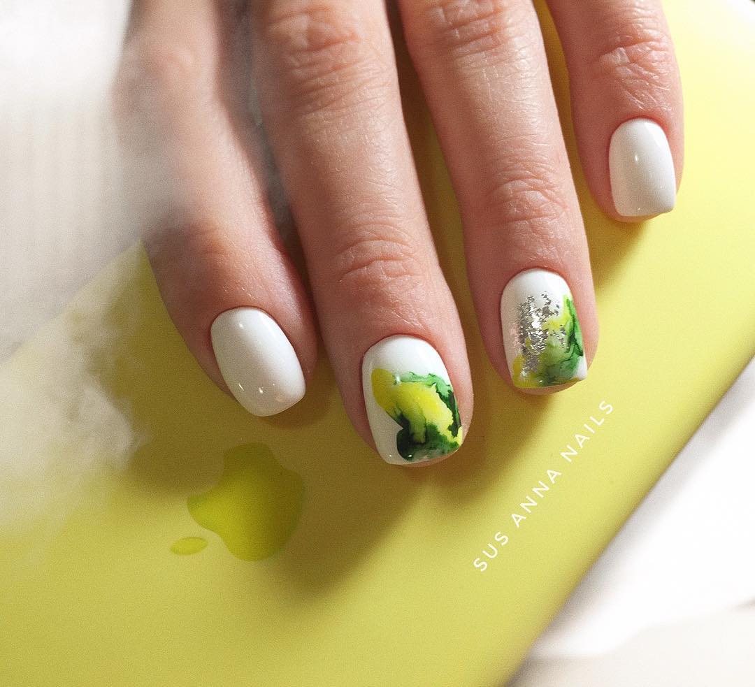 Акварельные мазки белого цвета. Для этой техники вам понадобится плоская кисть и разбавитель для акварели. На край ногтя наносится немного белого лака. Вы также можете использовать среднюю кисть и делать небольшие мазки, чтобы изменить фон рисунка.