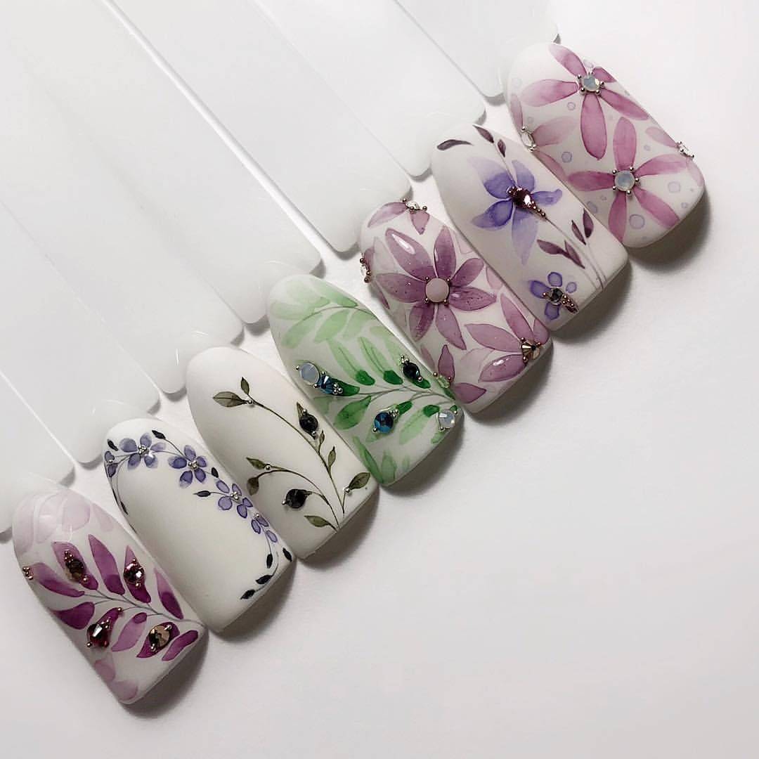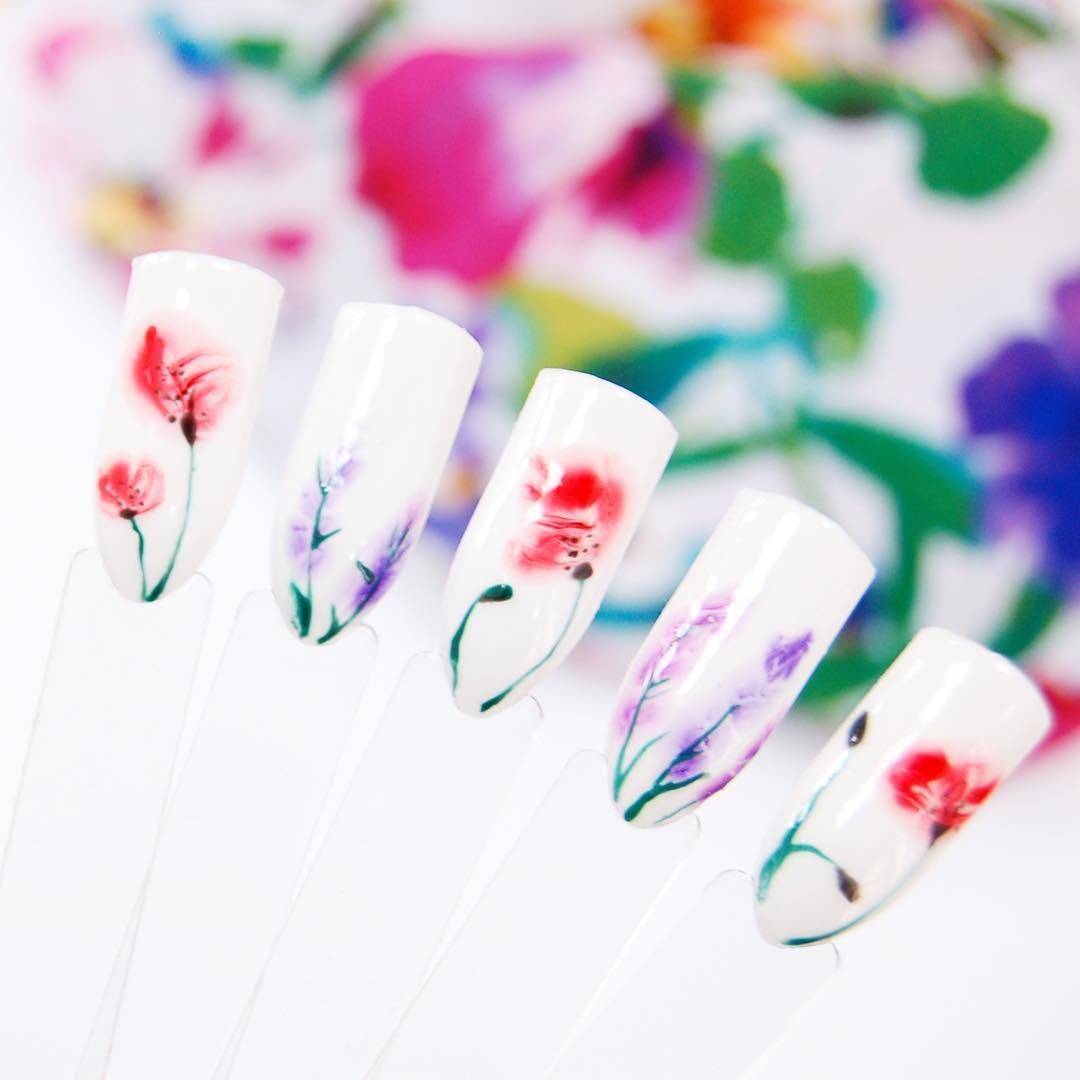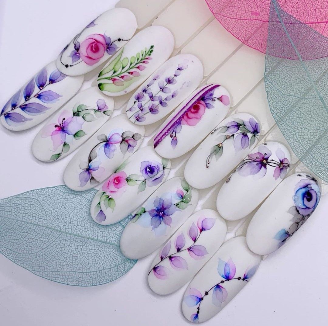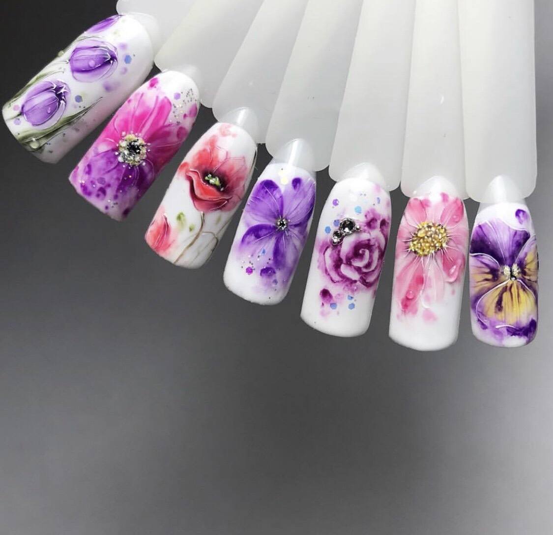 На протяжении многих лет цветочный принт является едва ли не самым популярным видом дизайна ногтей. Он используется в качестве французского декора, однотонного покрытия и многих других вариантов дизайна. Поэтому неудивительно, что цветы все чаще используются в технике акварели. Это позволяет смешивать оттенки в правильных пропорциях для получения нужных тонов. Примечательно, что эта техника не требует нанесения нескольких слоев краски. Самое главное – применять их аккуратно, без перерывов.