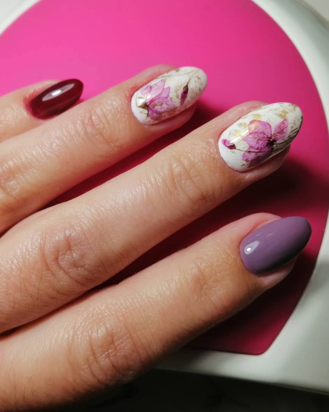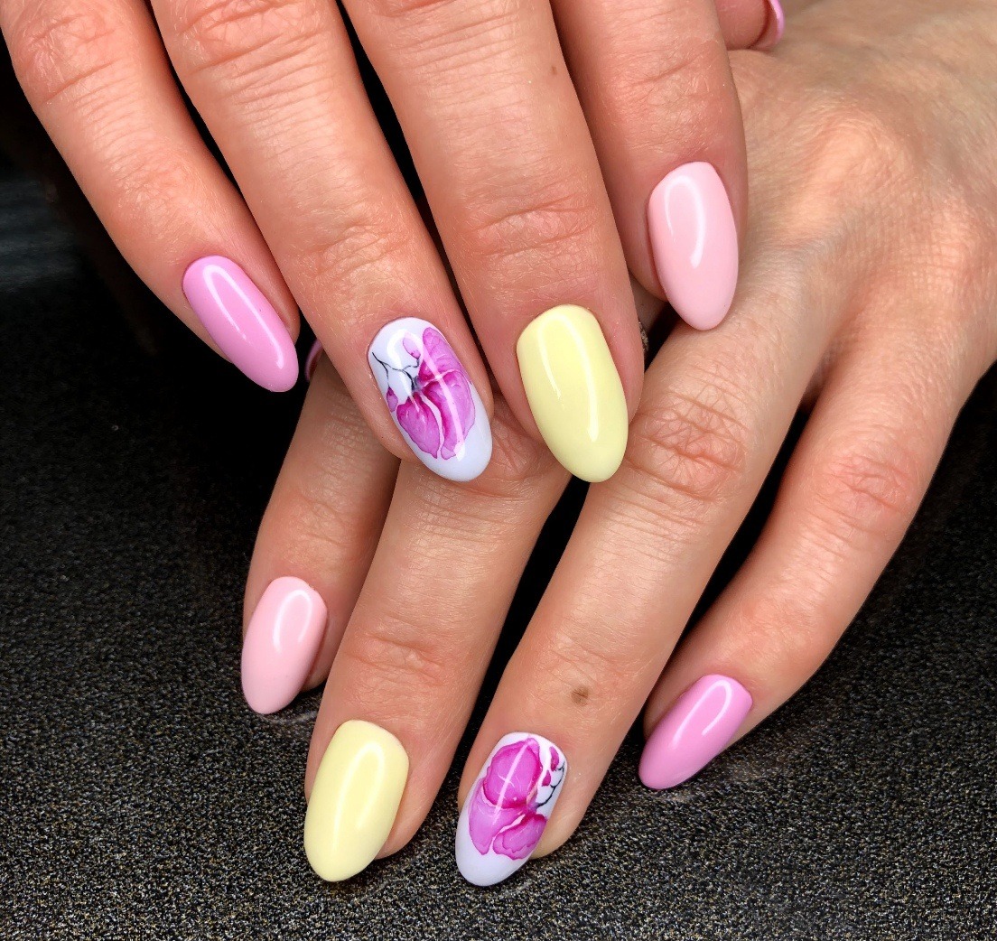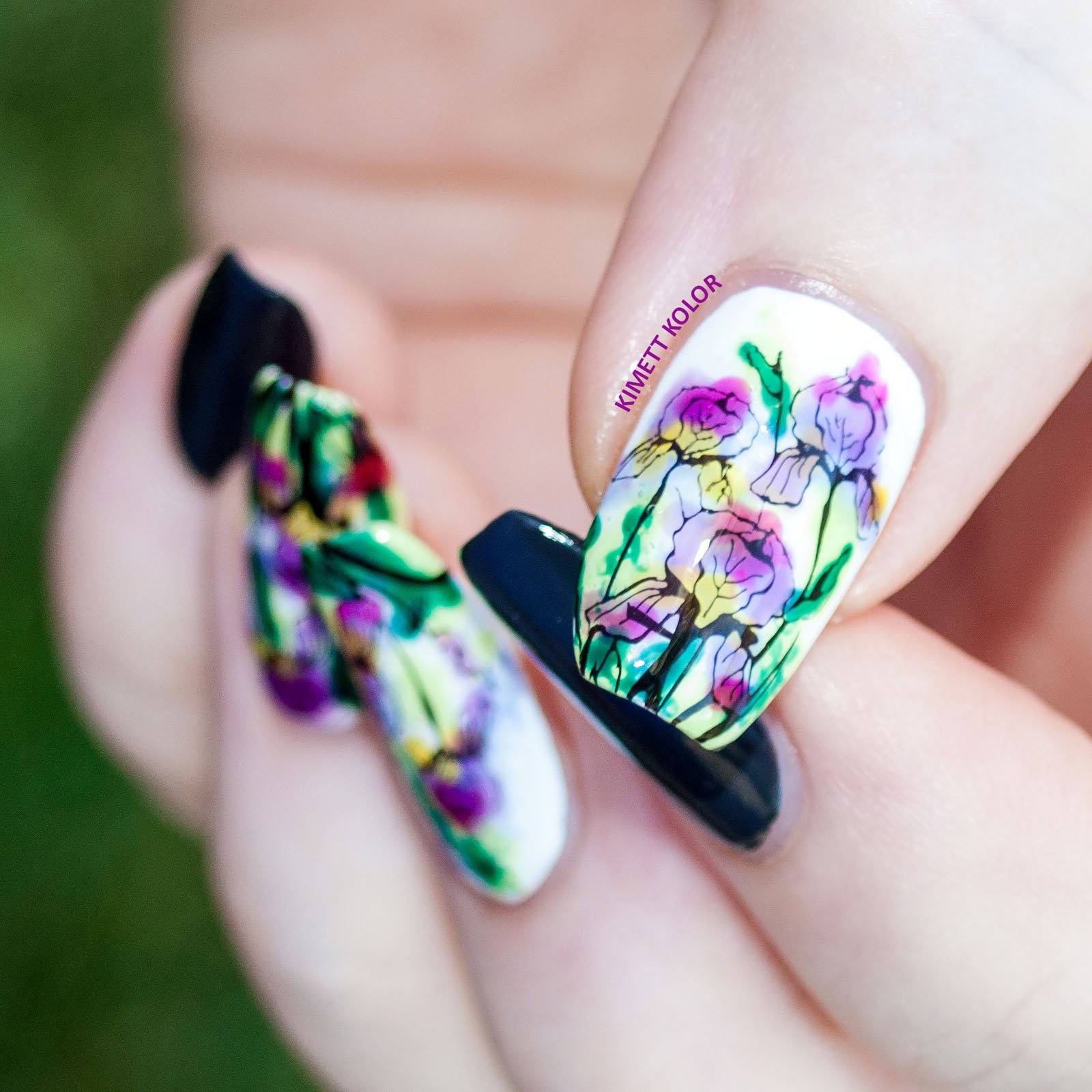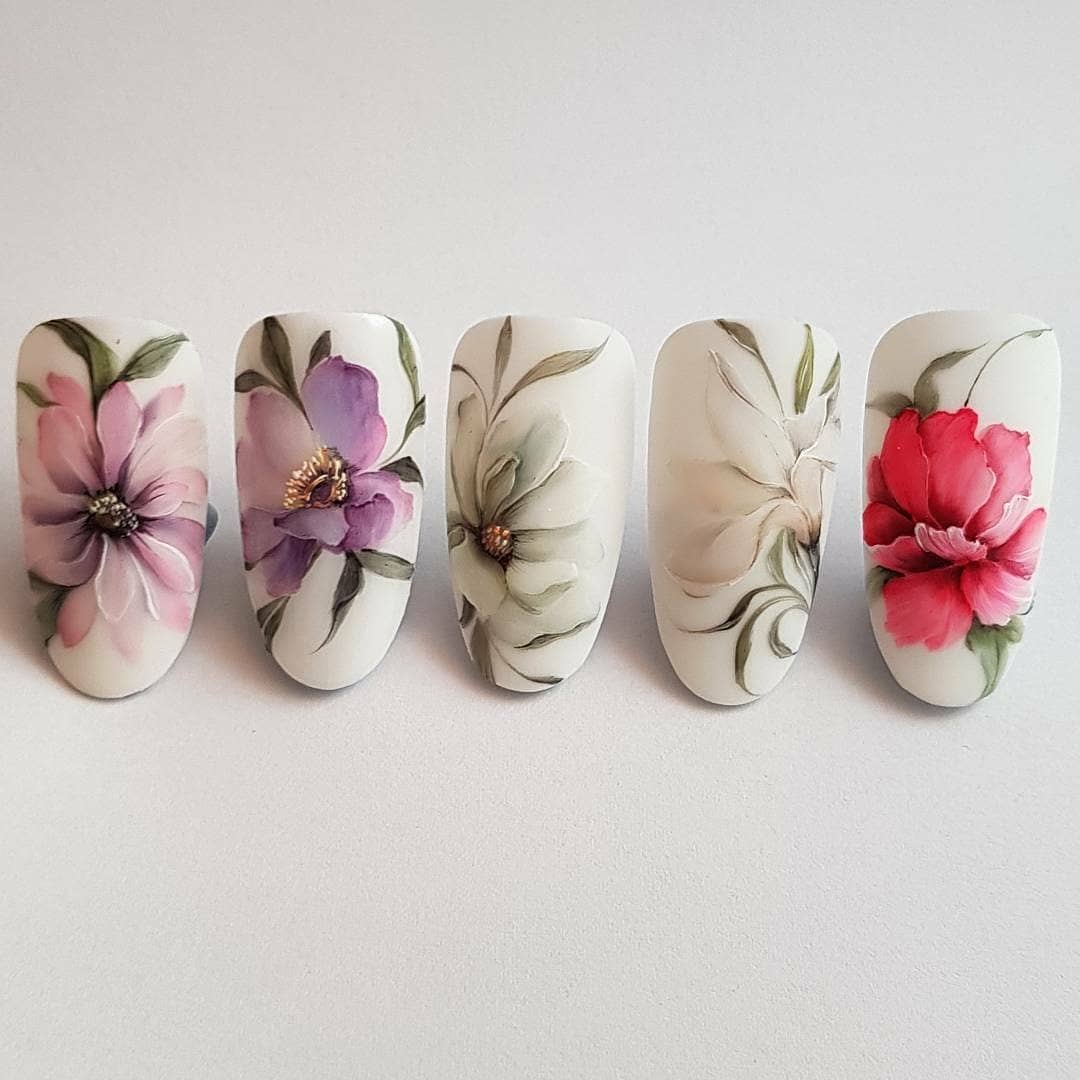 На протяжении многих лет цветочный принт является едва ли не самым популярным видом дизайна ногтей. Он используется в качестве французского декора, однотонного покрытия и многих других вариантов дизайна. Поэтому неудивительно, что цветы все чаще используются в технике акварели. Это позволяет смешивать оттенки в правильных пропорциях для получения нужных тонов. Примечательно, что эта техника не требует нанесения нескольких слоев краски. Самое главное – применять их аккуратно, без перерывов.