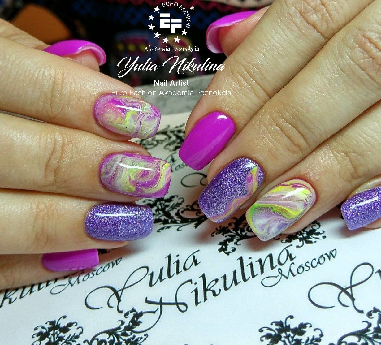 На подготовленные к покрытию ногти нужно нанести базовый цвет. Не дожидаясь его просушки следом с помощью тонкой кисти нанести небольшие капли различных цветов. А теперь самое интересное: вооружившись иголкой, следует аккуратно начать делать разводы, соединять цвета, чтобы они смешались между собой. В конце следует покрыть ногти прозрачным закрепителем.