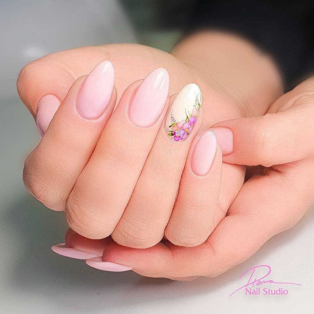 Акварель – это необязательно смешение ярких красок. На фото пример того, как создать нежный и женственный маникюр одним небольшим элементом.