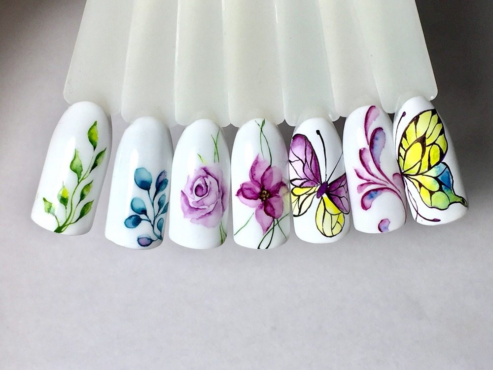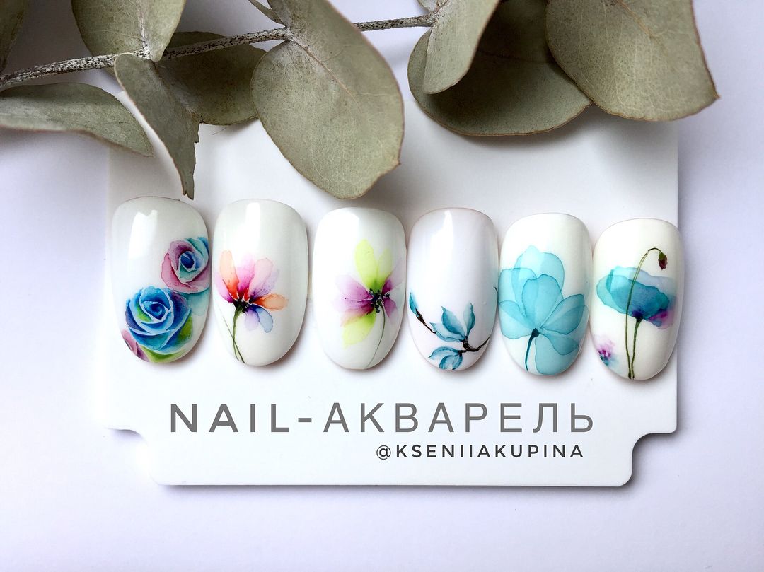 Рисунки на ногтях акварелью поэтапно делаются так: