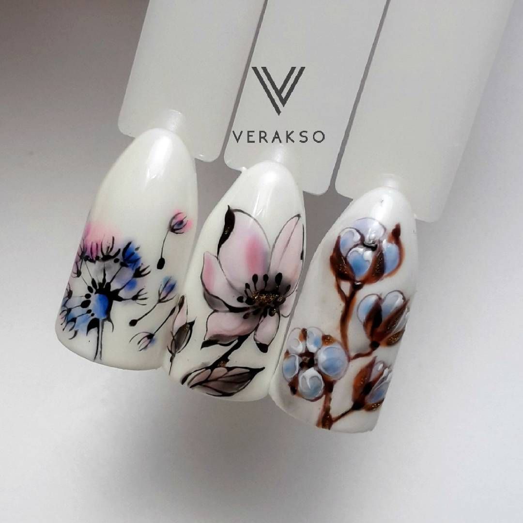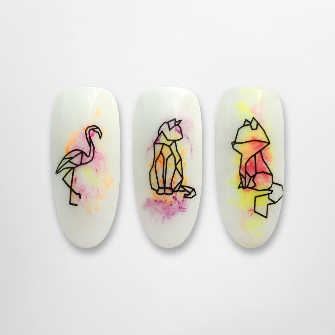 Это цветной лак для ногтей, который необходимо полимеризовать под лампой. Она может иметь различную степень плотности пигмента, в зависимости от производителя и эффекта. Этот материал имеет широкий спектр оттенков и часто используется для покраски. Акварельные рисунки на ногтях с использованием обычных гель-лаков выполняются поэтапно, при этом каждый нанесенный слой сушится непрямолинейно. В противном случае пигмент смешается, создавая неаккуратный вид.