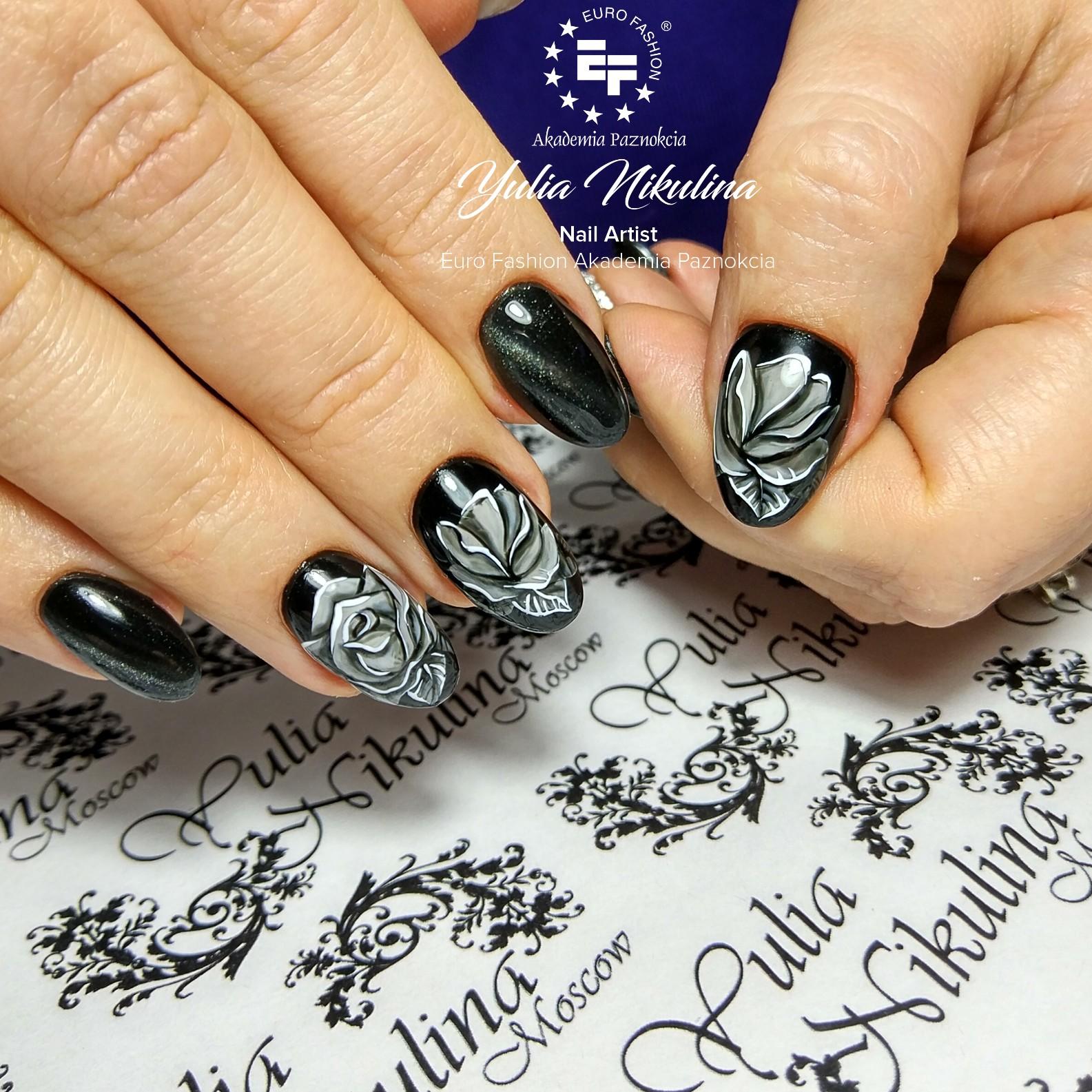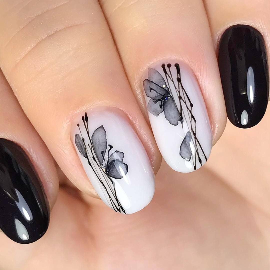 Размытые рисунки эффектно смотрится с матовым черным цветом, создавая изысканный контрастной маникюр.
