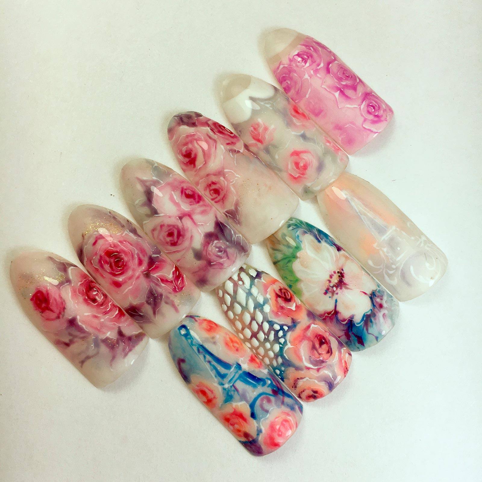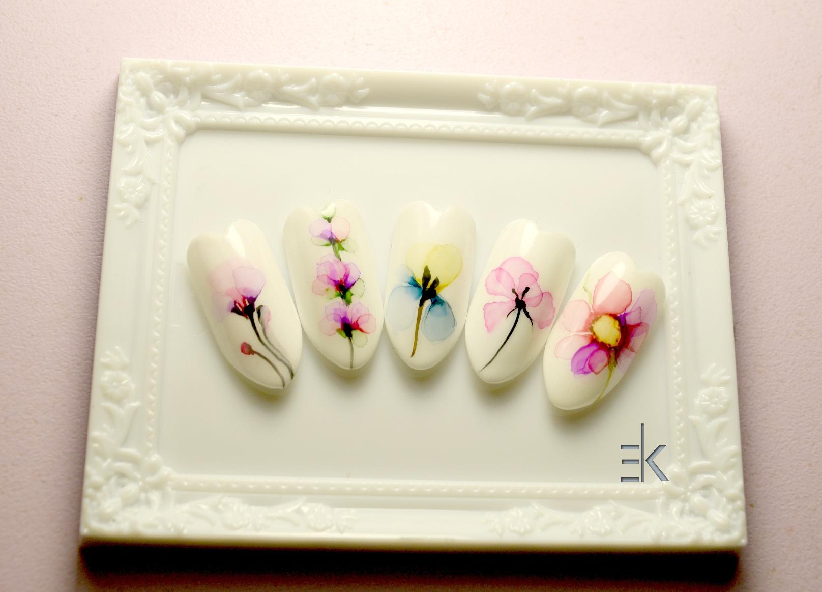 Чтобы маникюр на руках выглядел великолепно, необходимо освоить правильную технику создания акварельных узоров. К ним относятся: