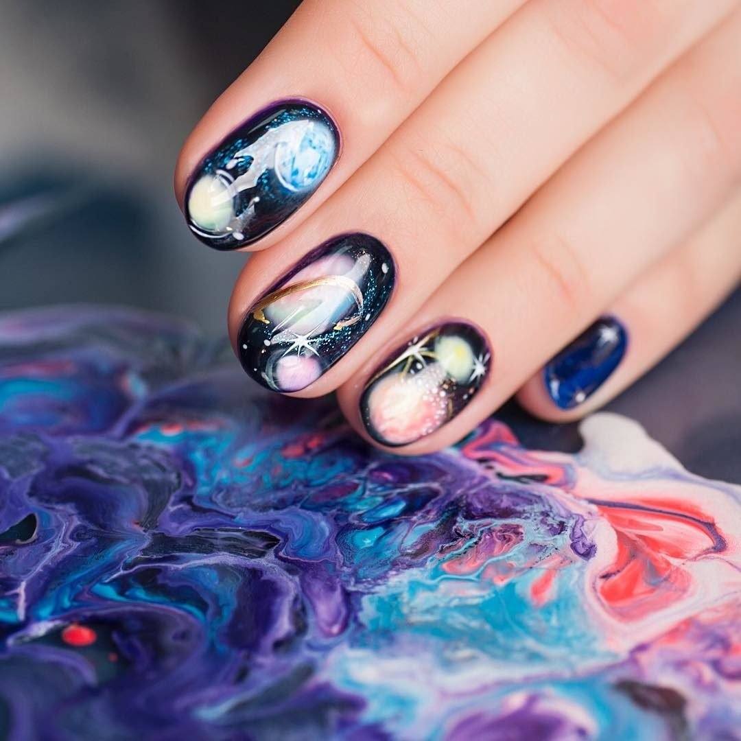 Если эта техника кажется вам слишком сложной, есть альтернативные варианты. Прежде всего, речь идет о готовых изображениях, которые представлены в виде дизайнов слайдеров или стикеров. С их помощью можно нанести рисунок симметрично или выбрать определенную его часть. Кроме того, наклейки часто используются для того, чтобы сделать акварельный маникюр в стиле луны. Всего несколько стразов или блесток – и дизайн будет выглядеть необычайно красиво.