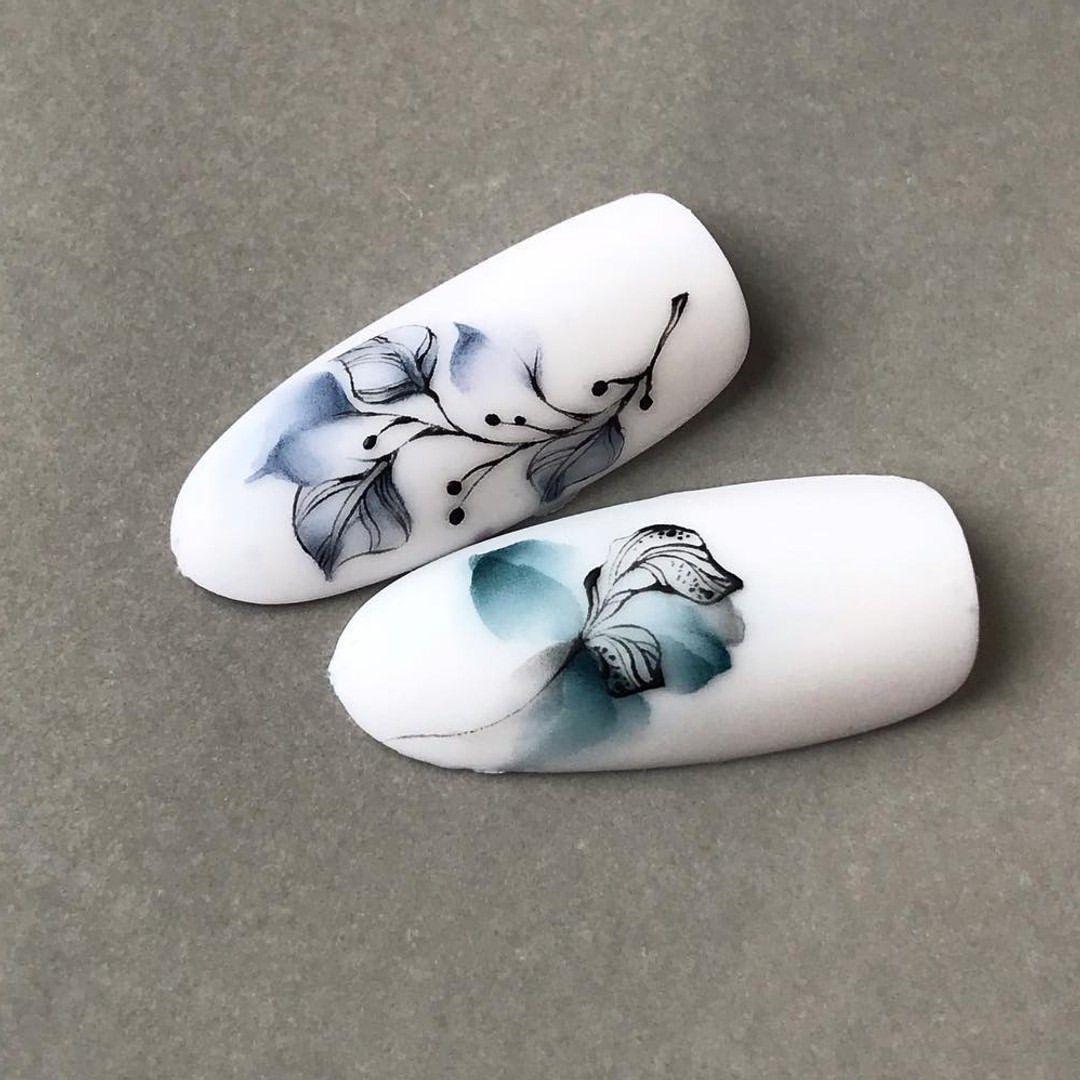 Тренд 2019 сезона – сочетание акварельной росписи с техникой «негативное пространство», которая подразумевает наличие прозрачных участков в нейл-арте. Также на пике популярности матовый топ для такого дизайна.