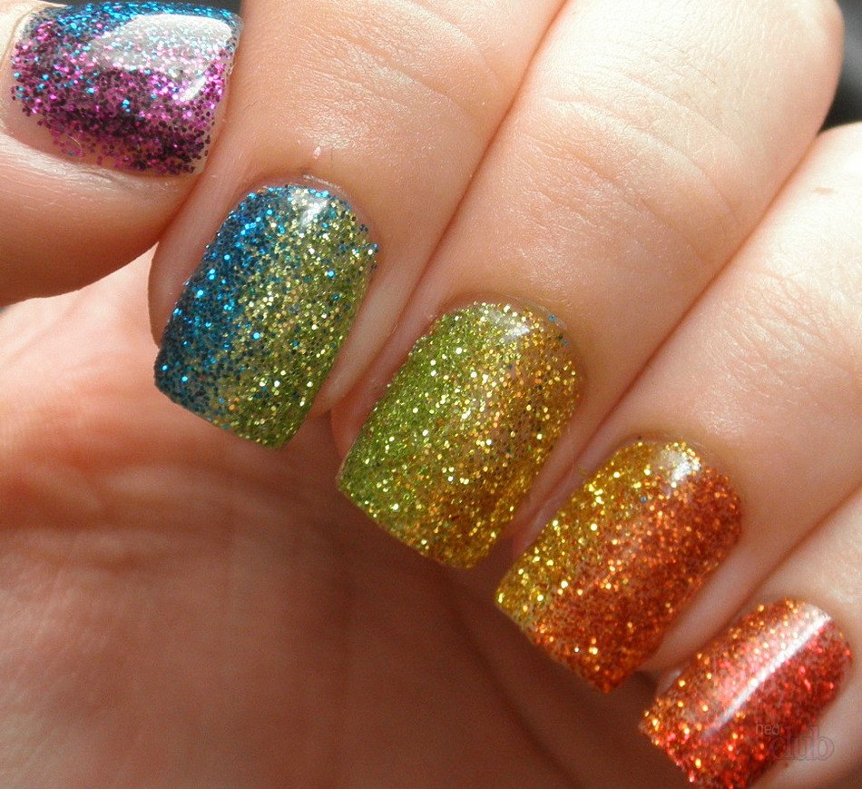 Волшебная радуга. Возьмите несколько цветов блестящей пыли. Поверхность ногтевой пластины визуально разделите на небольшие горизонтальные полоски. Нижнюю покройте бесцветным лаком, и сразу же на нее нанесите первый оттенок. Проделайте то же самое со второй, и так до конца.
