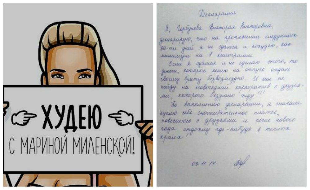 Если вас заинтересовала диета Марины Миленской, мы расскажем о том, что вас ждет в период вашего похудения. Прежде всего женщинам предлагается составить декларацию- это один из основных моментов мотивации. Написание декларации выглядит так: