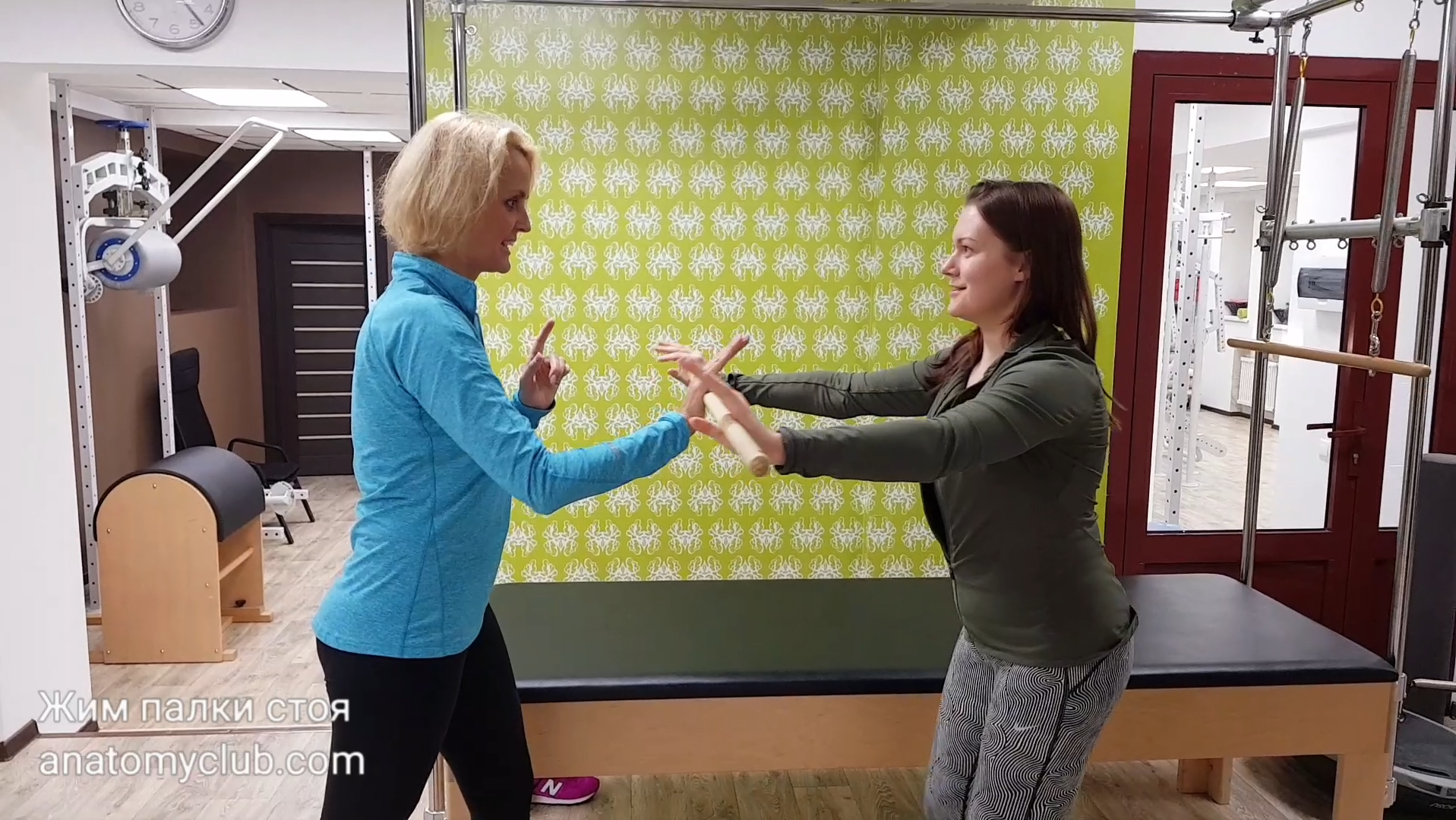 ЖИМЫ ДЕРЕВЯННОЙ ПАЛКИ СТОЯ ЭКСЦЕНТРИКА + КОНЦЕНТРИКА Клиенту важно научиться находить опору внутри себя. Тренер давит на палку, клиент уступает, затем концентрически выжимает и тренер в свою очередь уступает. Тренер может в любой момент убрать руку