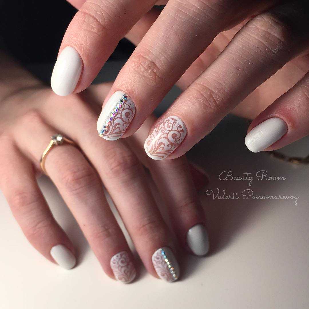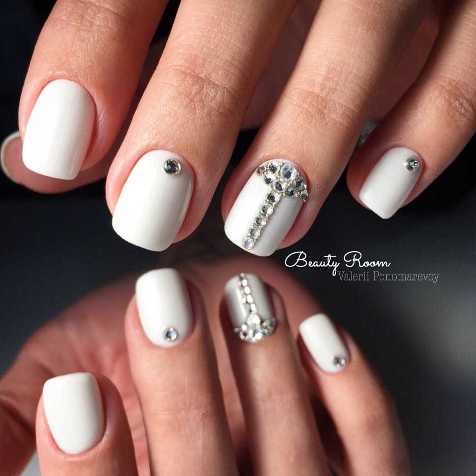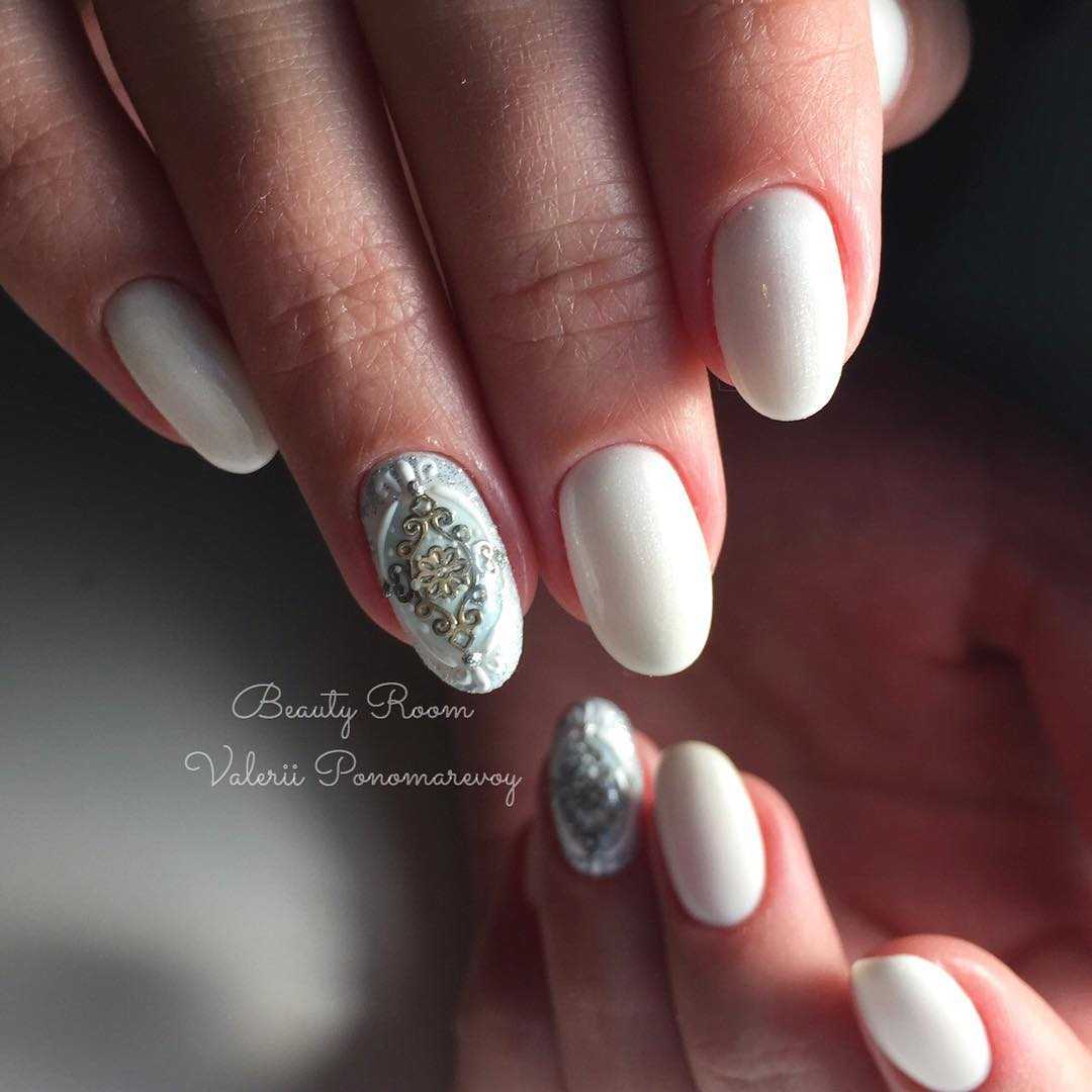 Белый маникюр в сочетании с серебряной втиркой, фольгой или стразами смотрится всегда интересно.