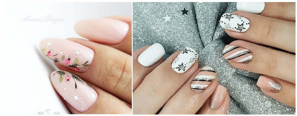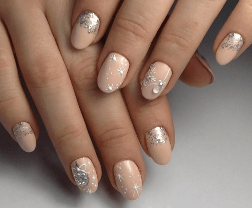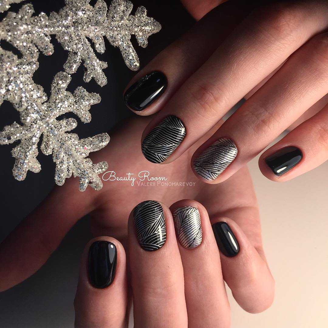 Можно просто поиграть с модными нынче звездами и снежинками, рисуя их серебром или золотом, нанося с помощью стемпинга или клея наклейки, а может, просто выкладывая стразами или камифубуки. От того, какими цветами и деталями вы их обыграете такой и будет маникюр, т. е. если вы нарисуете на холодном бежевом фоне черную звездочку это будет минимализм, который более повседневный, если вы ноготки украсите серебряными снежинками и одной золотой звездочкой это уже желание праздника и веселья.