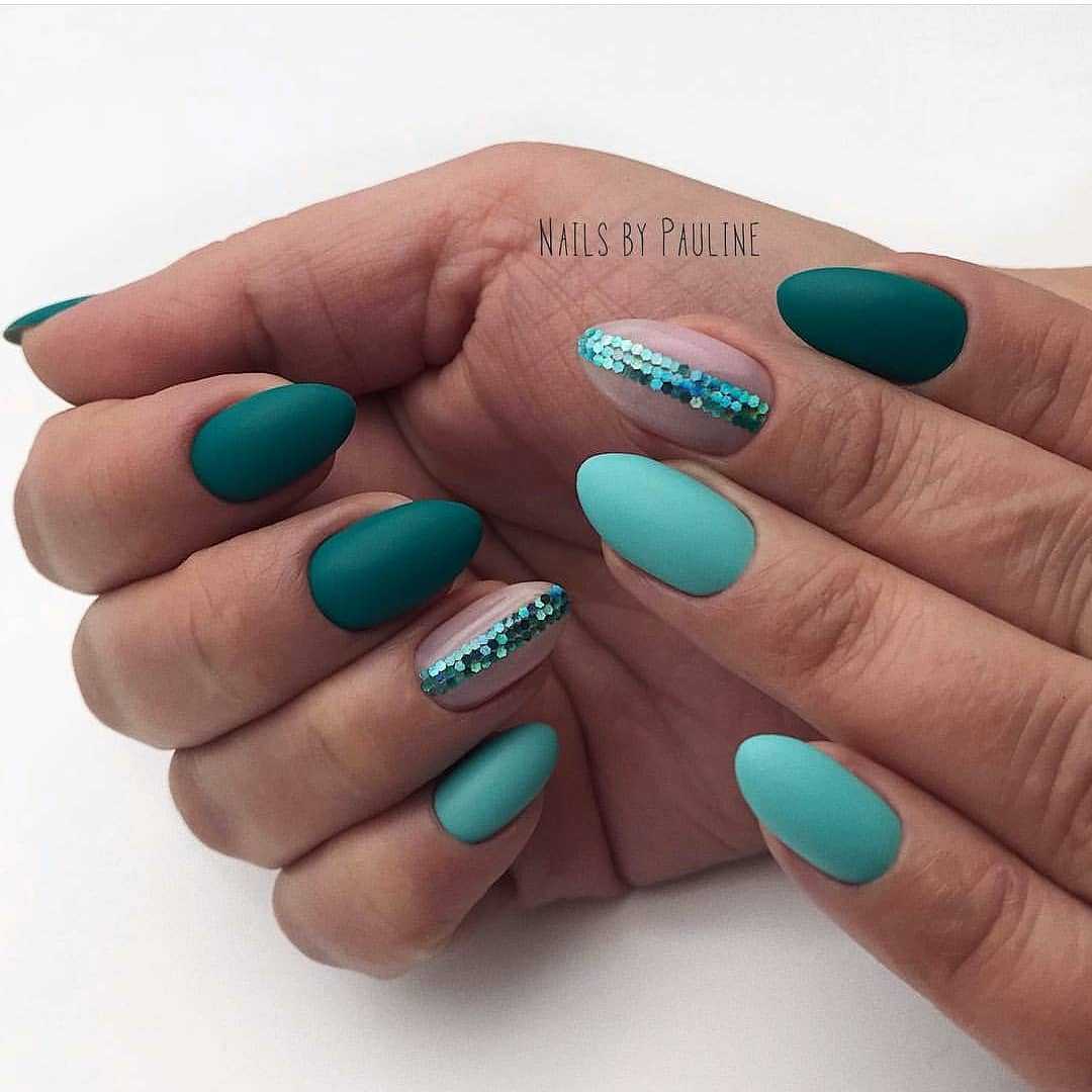Чтобы миндальным ноготкам придать свежесть, стоит просто добавить блесток. Такой дизайн ногтей можно носить и на праздничные мероприятия, и каждый день.