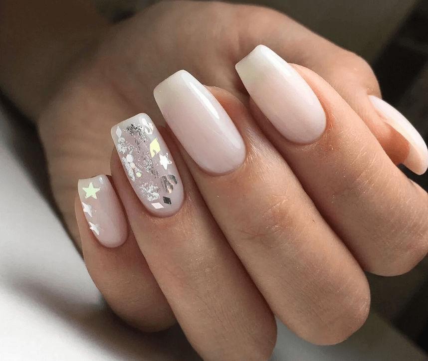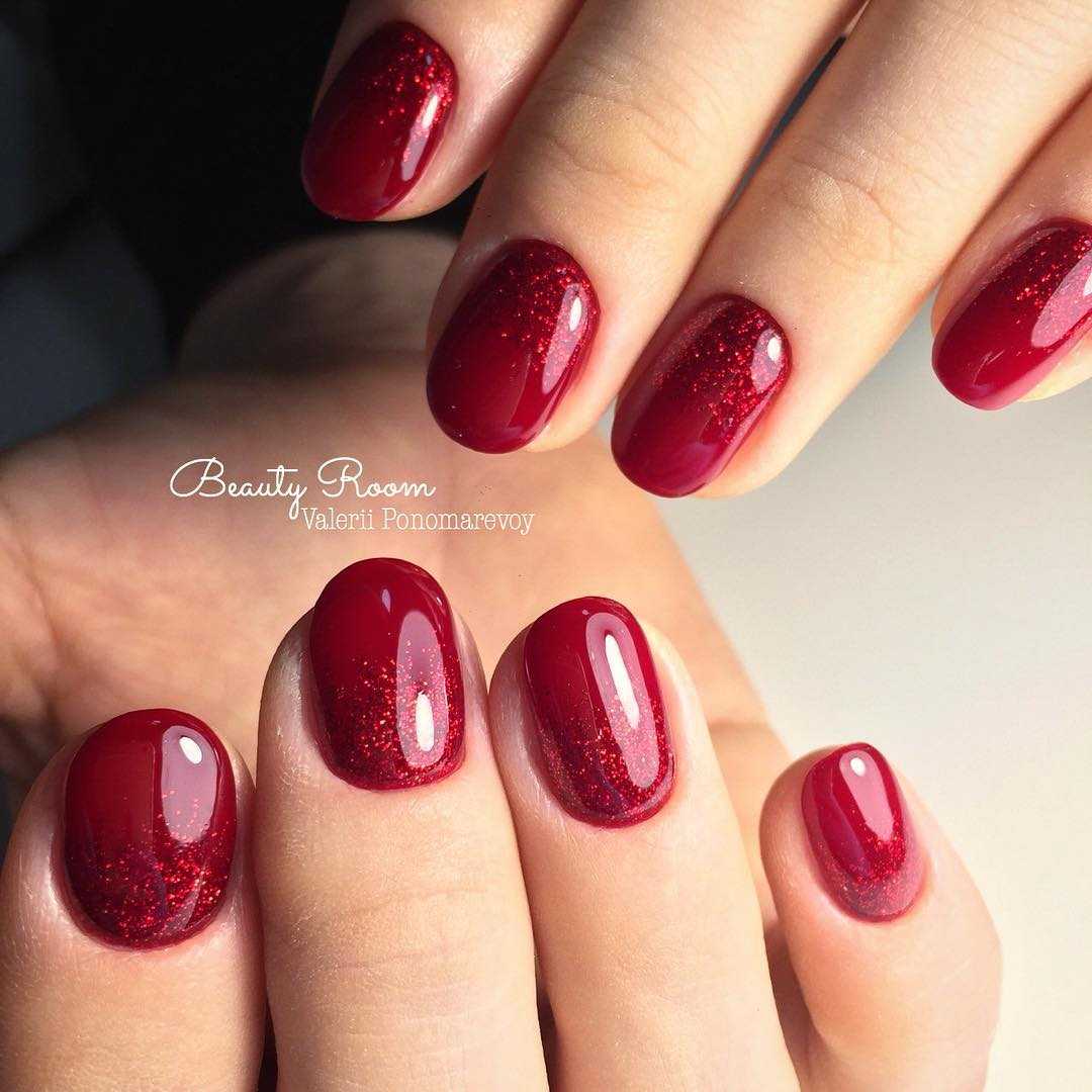 Но есть способ градиента, который не требует таких затрат, а выглядит еще эффектнее – это омбре блестками. Для его выполнения нужно просто накрасить ногти однотонным лаком, а сверху присыпать его мелкими блесками с плавным уменьшением густоты от края к центру.