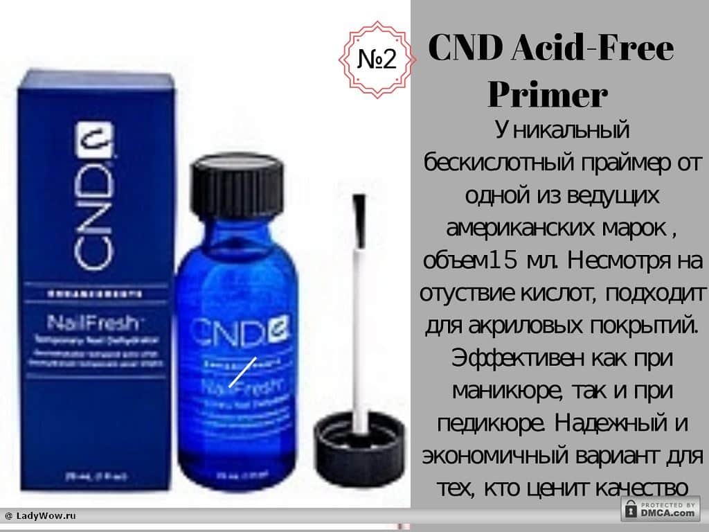 Праймер, среди ингредиентов которого кислота отсутствует, безопаснее, но уступает по степени адгезии. Профессионалы рекомендуют его выбирать, если выполняется маникюр гель-лаком.