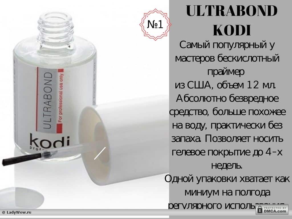 - Kodi Ultrabond – безопасная формула, которая не сжигает пластину и кутикулу, удобство нанесения благодаря аккуратной кисти;