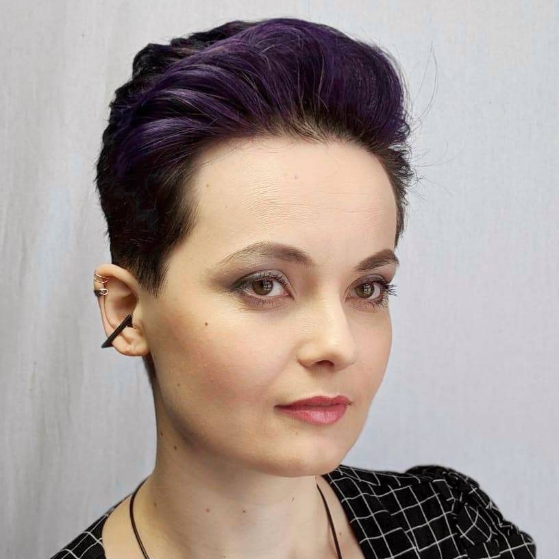 Удлинить личико поможет стрижка «Высокое пикси». Длинная асимметричная челка скроет полноту щек и сделает лицо более узким.