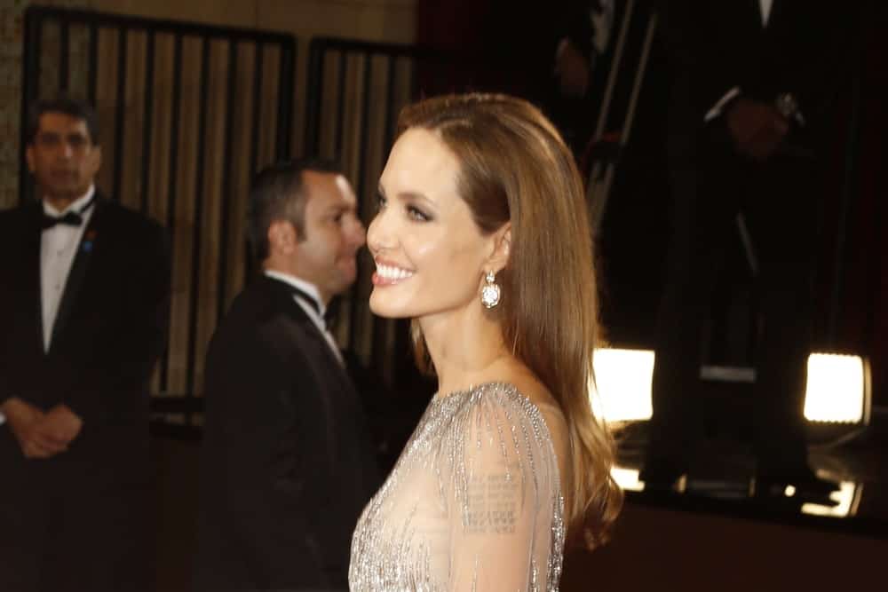Анджелина Джоли сияла своей красивой улыбкой на 86-й ежегодной церемонии вручения награды Академии в Голливуде и Хайленд-центре 2 марта 2014 года в Лос-Анджелесе, штат Калифорния. На ней было прекрасное прозрачное платье, которое она сочетала с длинным хвостом.