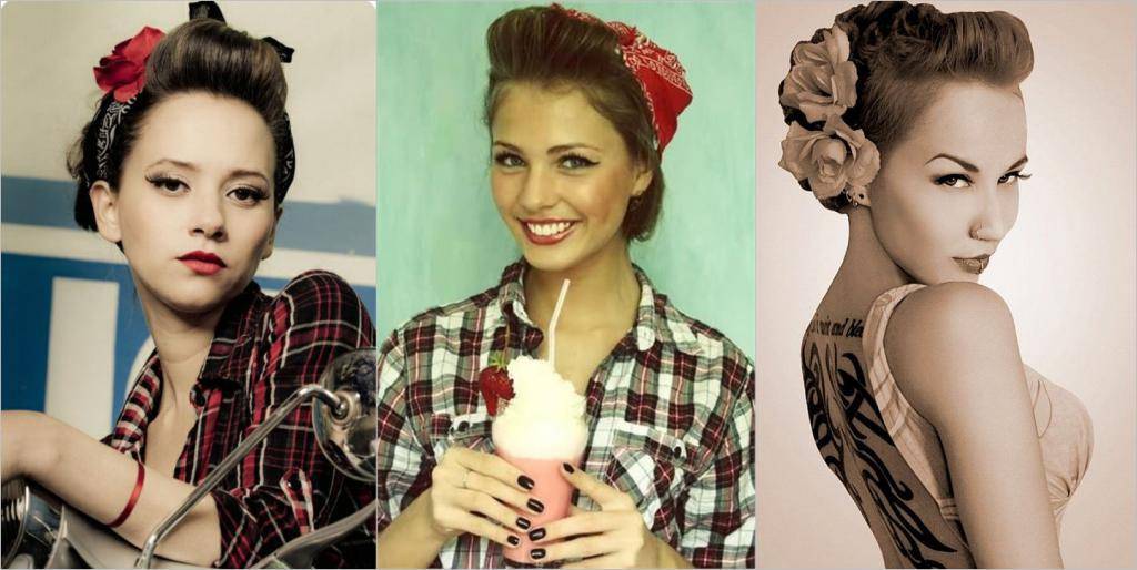 Но главное, что отличает причёски пин-ап, это яркие косыночки, шляпки, повязки и газовые шарфики, повязанные бантом или простым узлом. Для создания и закрепления причёски используются невидимки и шпильки, как обычно, но отделка причёски очень выразительна. При этом платки и шарфики обязательно вписываются в остальной наряд, в той же гамме цветов или, наоборот, создают броский контраст. Но уж с цветом губной помады они обязаны красиво сочетаться.