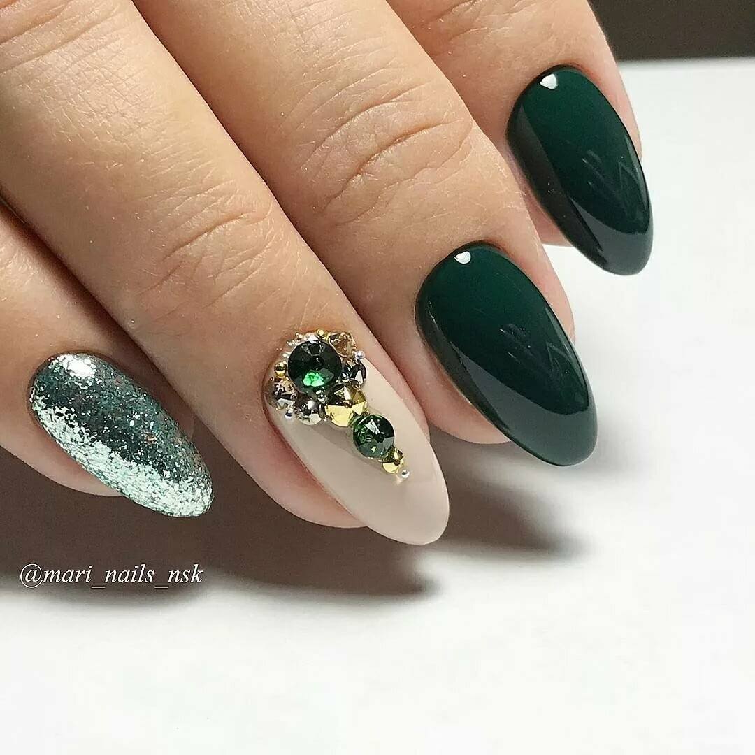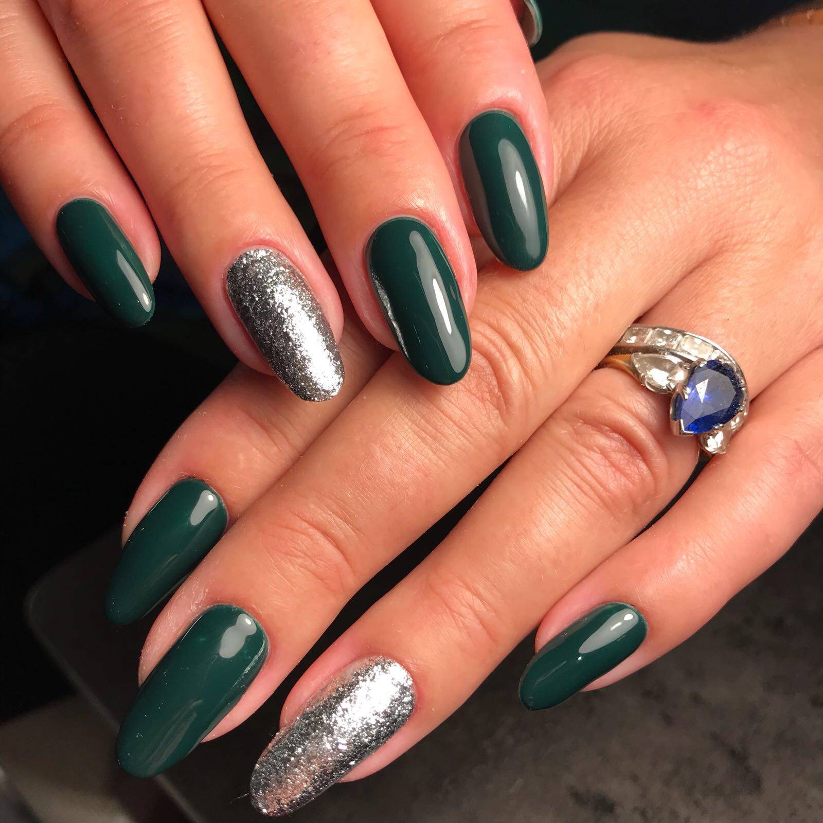 Самый простой и красивый вариант – это поочередное окрашивание ногтей зеленым и серебряным цветом. Такой нейл-арт без проблем впишется в любые ваши образы, он смотрится благородно и сдержанно. Особенно красиво серебряный декор выглядит в сочетании с матовой зеленой текстурой. Выполните полосы глиттером на зеленом фоне, выделите глиттером край ногтя и прикорневую зону. С зеленым цветом можно выполнять абсолютно любой декор, который вы ранее использовали с другими оттенками.