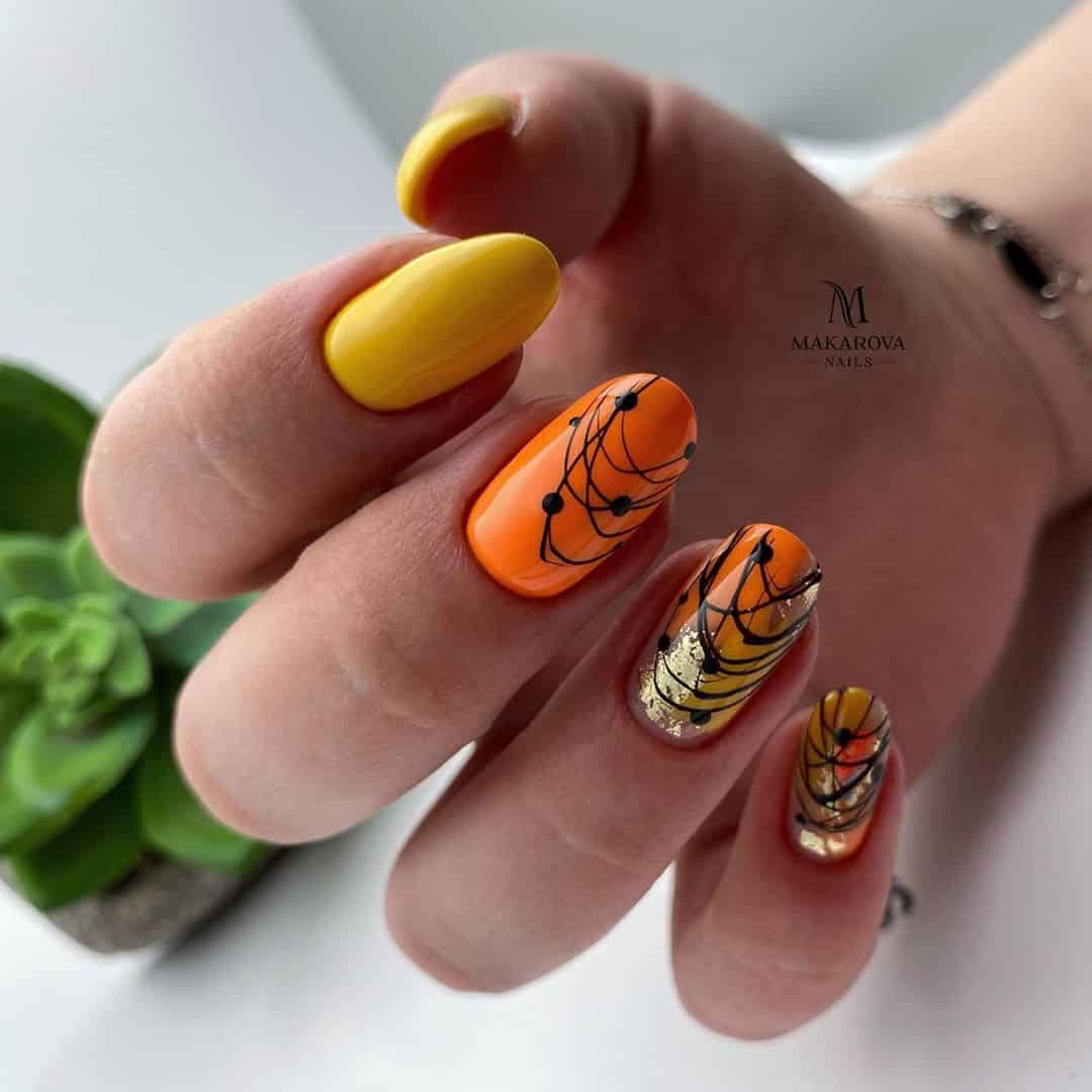 Сверху ногти покрывают серым, оранжевым и розовым гель-лаком. Для более яркого эффекта можно сверху нанести прозрачный блестящий слой.