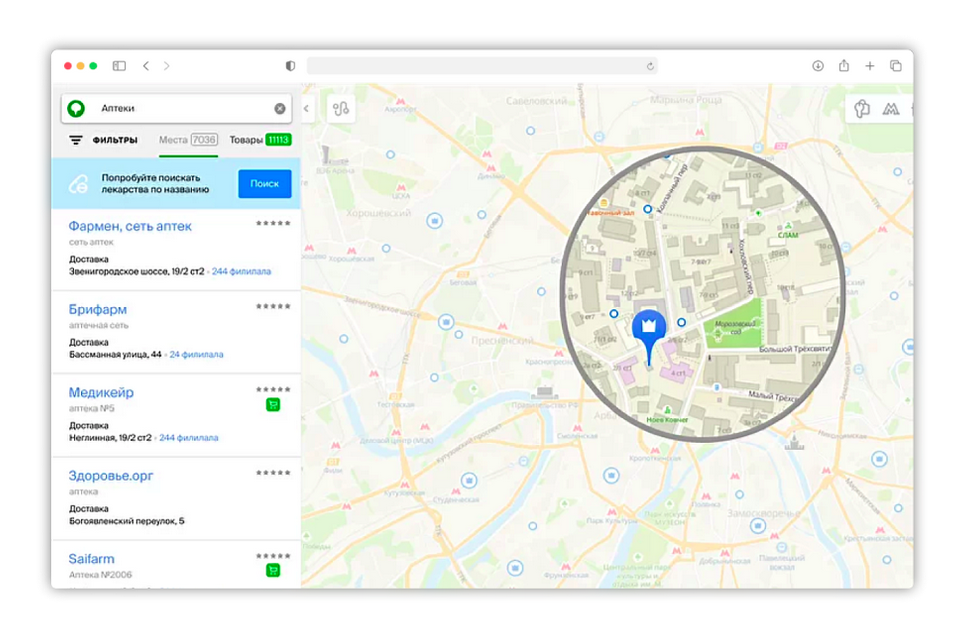 В Яндекс.Картах сначала показываются все компании, которые купили приоритетное размещение, а места в выдаче между ними распределяются в зависимости от удаленности от пользователя.