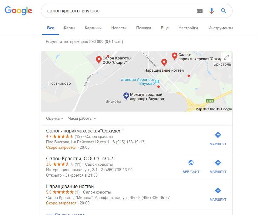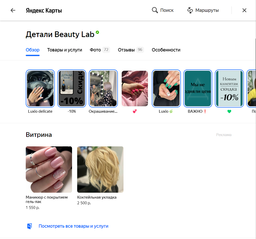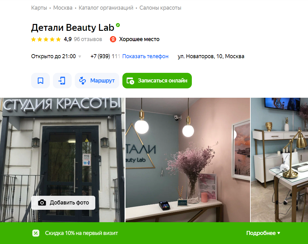 Если сайт грамотно продвигается и карточки на картах заполнены полностью, то салон красоты, наверняка, будет одним из лидеров на картах в своем районе.