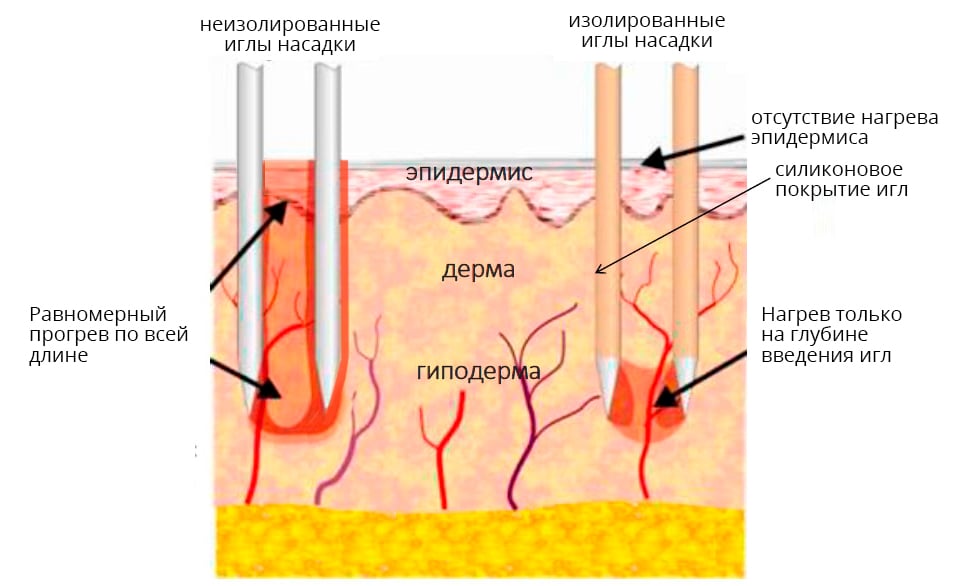 Изолированные иглы проводят ток непосредственно на заданную глубину, где и происходит локальный нагрев необходимого нам слоя для стимуляции выработки и ретракции коллагена.