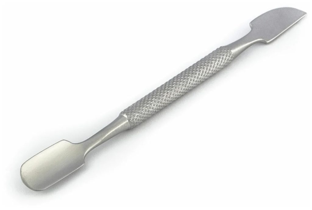 Первый используют для удаления грязи с внутренней стороны свободного края ногтя и прочистки ложбинок вдоль ногтевых валиков. Второй наконечник чаще делают в виде закругленной лопатки, которую используют для сдвигания кутикулы с ногтевой пластины и удаления птеригия, слоя кожи, прирастающего к ногтю по кромки кутикулы.Лопатка металлическая (пушер). Пушер имеет происхождение от английского слова push — толкать. Как ясно из названия, инструмент предназначен, для отодвигания кутикулы перемещения чего-нибудь без резки. Например, сдвигания наросшей кожи с плоскости ногтя. Главное отличие пушера от шабера – пушер не имеет режущих свойств.