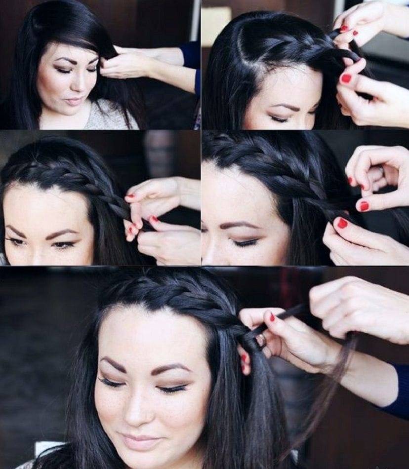 Длинная чёлка оригинально смотрится в косе, проходящей через весь лоб или вдоль одной из его сторон. Её кончик прячут в причёску или закрепляют невидимками. Опоясывающая лоб коса сделает образ нежным и оригинальным.