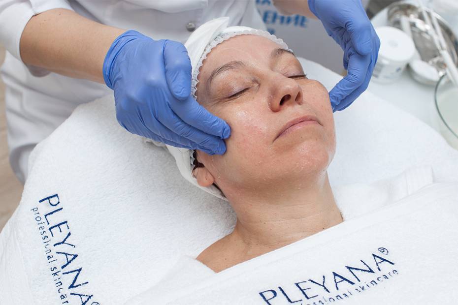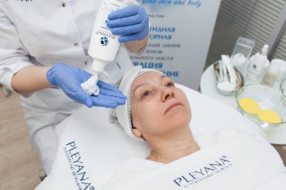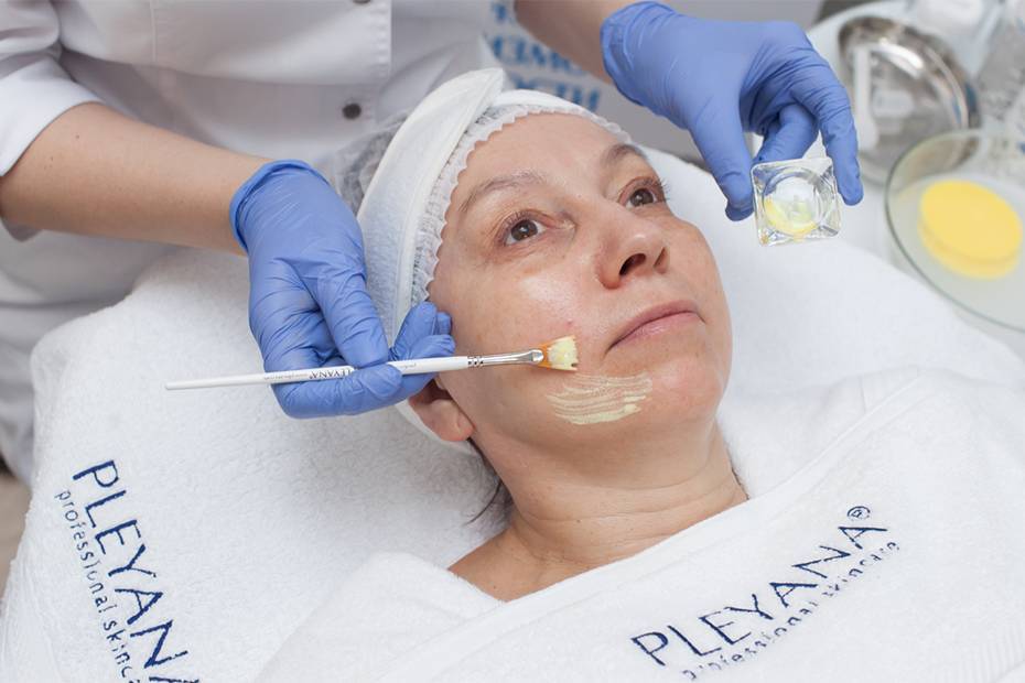 Следующий этап – нанесение пилинга. Его могут распределять как по всей поверхности лица, так и на отдельные участки.