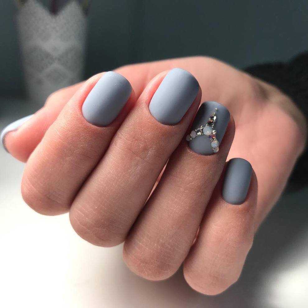 Попробуйте матовое покрытие темных цветов. Его удачно дополнят стразы.