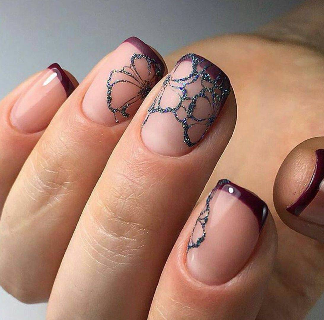 В данном дизайне отсутствует традиционная улыбка – ее заменяют красивые вензеля с глиттером. Чтобы повторить такой изысканный маникюр, нужно покрыть ноготки бежевым лаком, а после его высыхания провести тонкую нижнюю границу улыбки. Потом начинается самое интересное – рисование узоров. Когда завитки высохнут, подчеркните их серебристым лаком.
