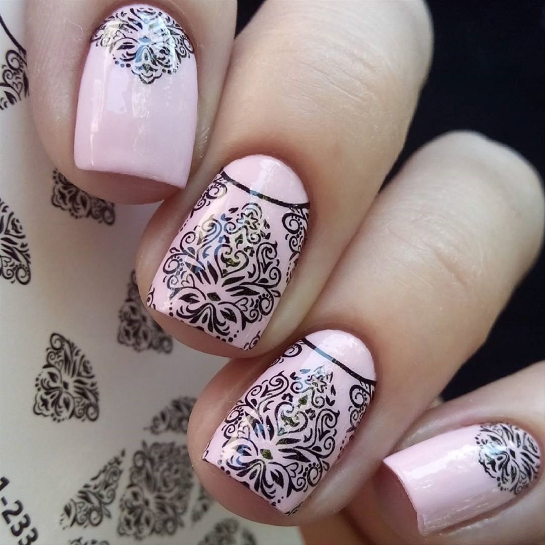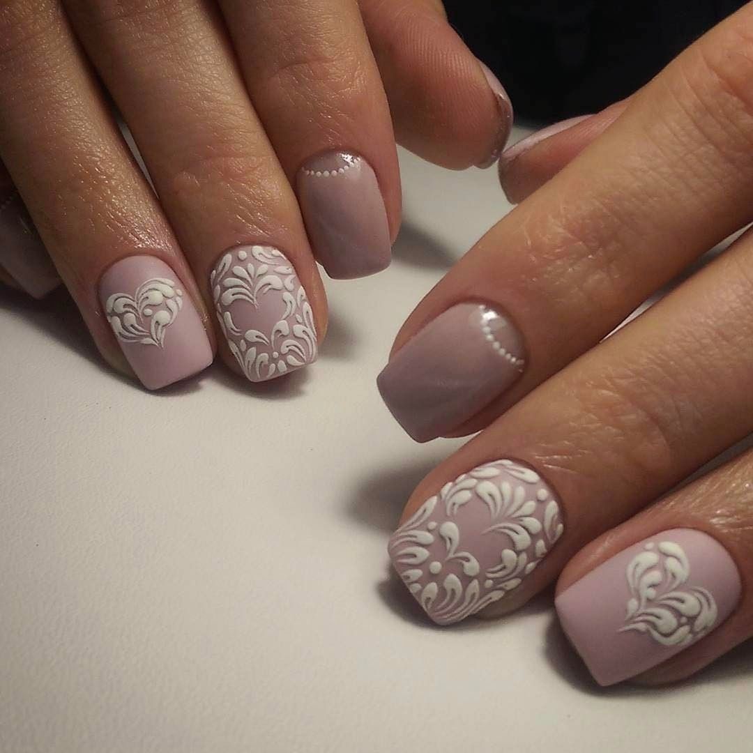 - кружева и блёстки. Большая сложность заключается в том, чтобы сделать маникюр красивым и эстетичным, а не громоздким. Для этого нужно знать меру: основой для маникюра послужит матовый гель-лак, который не привлечёт к себе особого внимания, остановитесь на сдержанных тонах. Далее пойдут блёстки, который должны быть не слишком контрастными, их располагают на безымянном или указательном пальце. Кружевная роспись отлично подойдёт для среднего пальца, а остальные ногти должны сохранять целостность композиции и иметь только матовой покрытие, без лишнего декора;