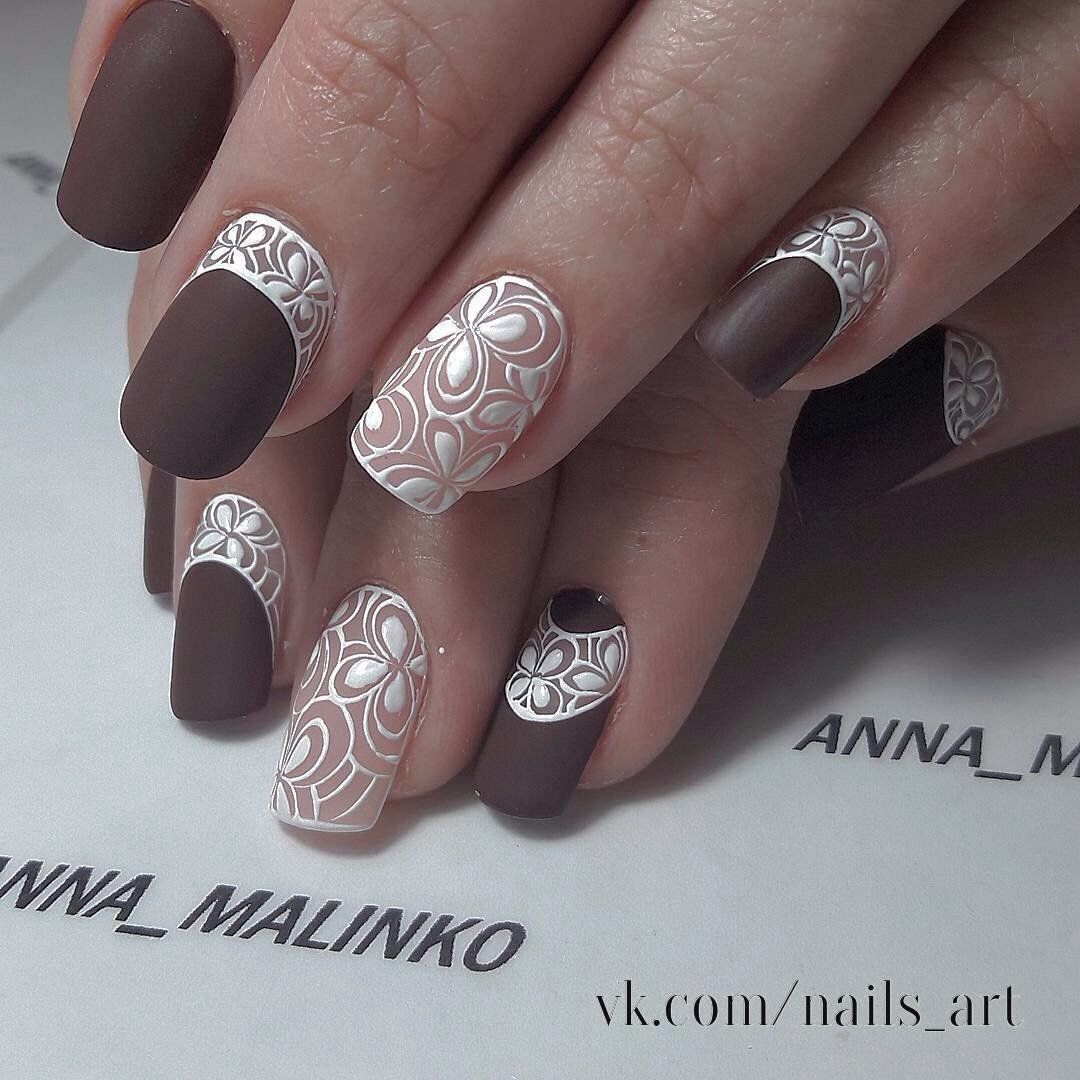- матовый. Трендом предшествующего года является совмещение гель-лаков. То есть сделайте подложку ногтя матовой, а сам ажурный рисунок глянцевым и получите потрясающий, модный маникюр, который точно оставит вас в центре внимания.