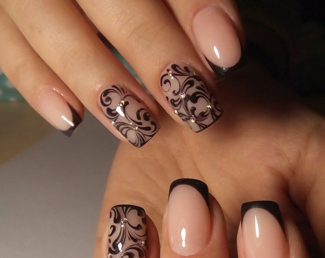 - френч. Актуальный на 2023-2024 год френч с острой улыбкой отлично гармонирует с ажурной росписью, особенно если работа выполнена на миндалевидных ногтях;