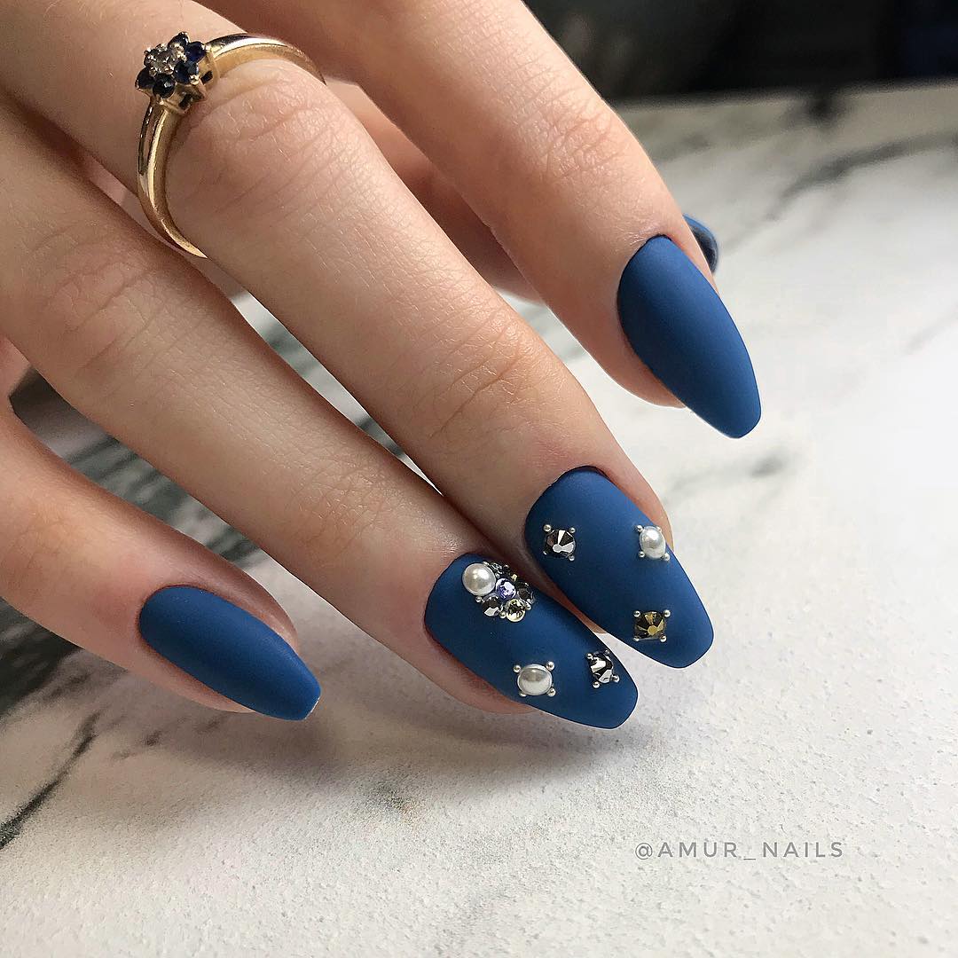 Эффектно золото смотрится с любым оттенком синего. Но в тренде носить именно темный матовый маникюр с золотым декором (блески, стразы, фольга, втирка, литье). Считается, что теплые оттенки синего оптимально подходят под золото, но современные решения в маникюре ломают данный стереотип.