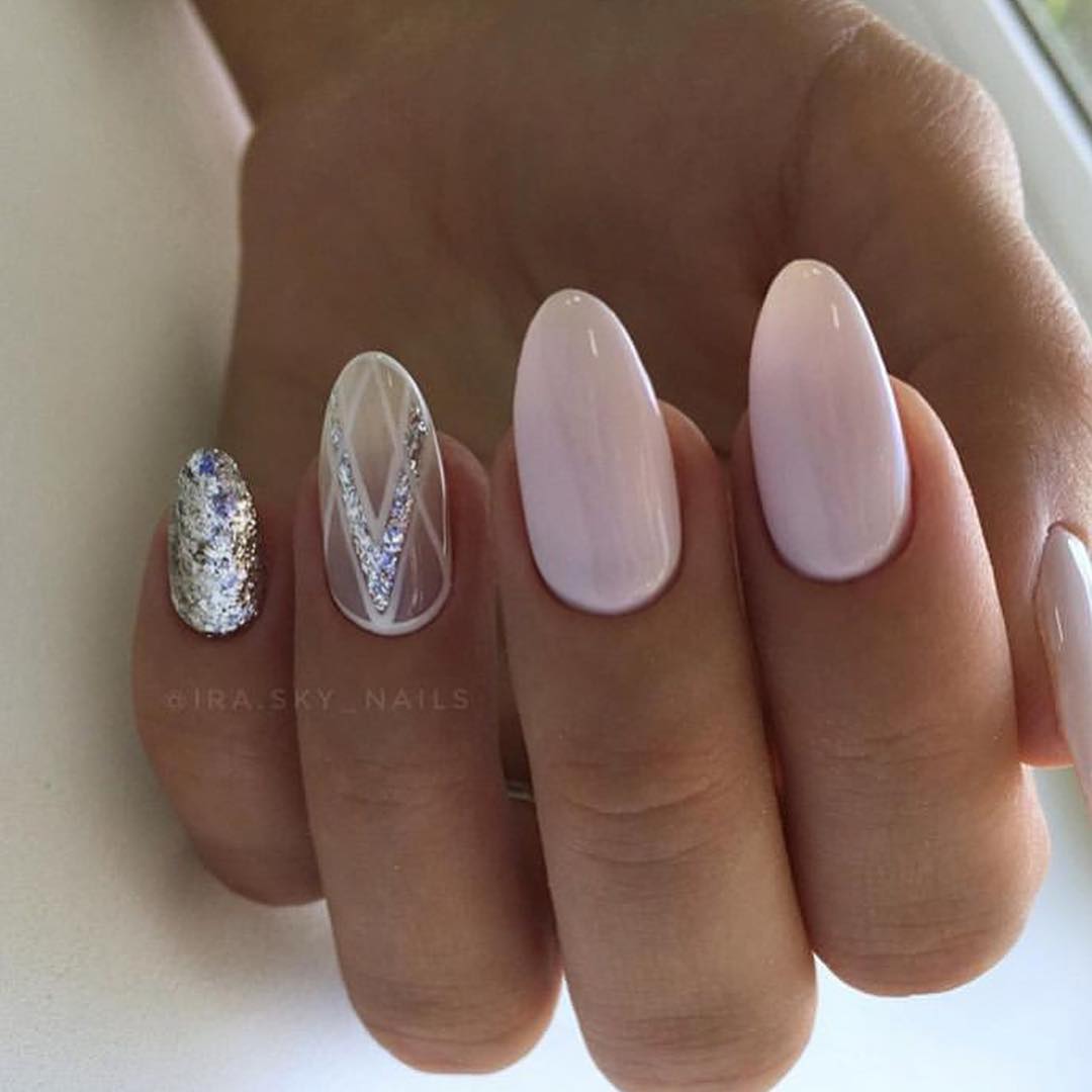 Очень модно в 2017 использовать в нейл-арте металлизированные лаки. Если хочется сделать стильный и милый маникюр для романтического свидания или вечером, можно взять спокойный нюдовый оттенок в качестве основы и совместить его с серебристым покрытием, выделить им лунки и полностью окрасить акцентные ноготки.