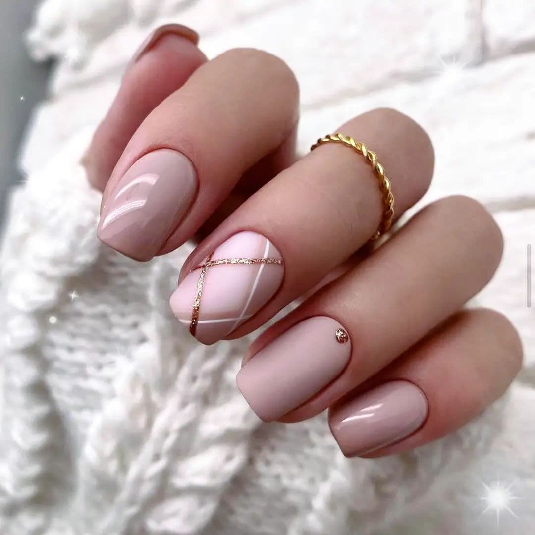 На нюдовом фоне красиво выглядит растяжка блестками, дизайн с геометрией, флористикой. Под блестящий декор обычно выделяется 1-2 ноготка, остальные же покрываются однотонным нюдовым оттенком. В однотонном исполнении красиво выглядит кофейный, серый, бежевый, молочный цвета. При этом можно без опасений использовать золотой глиттер. В сочетании с нюдовыми тонами он будет смотреться сдержаннее и мягче.