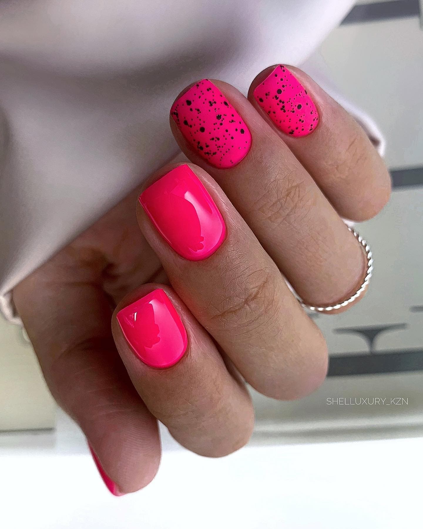 - выборочное окрашивание ногтей в неоновый розовый лак, остальные ноготки могут окрашиваться в другие цвета (белый, черный, серебристый оттенок);