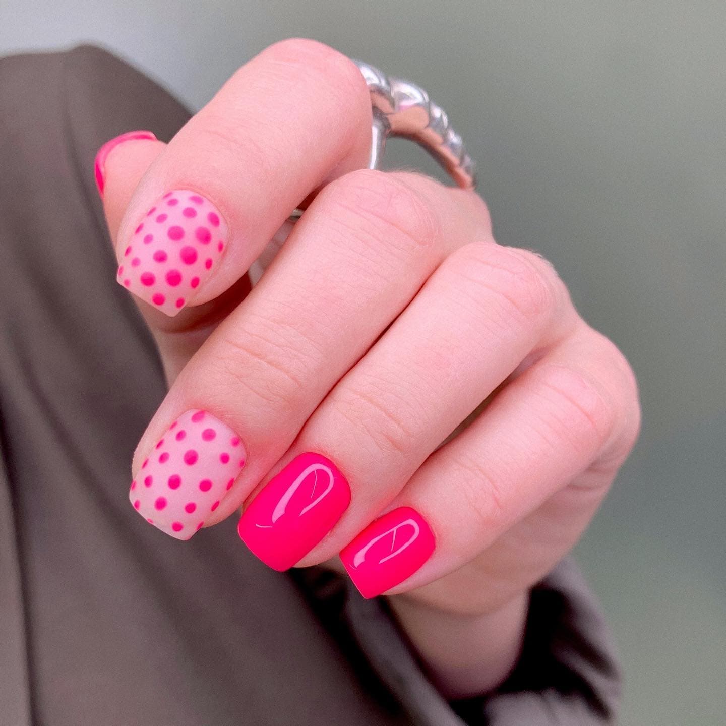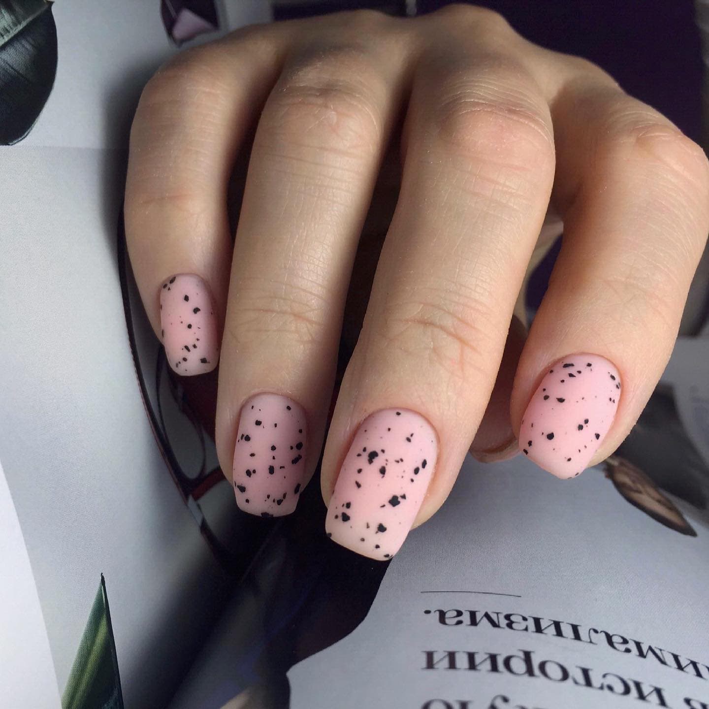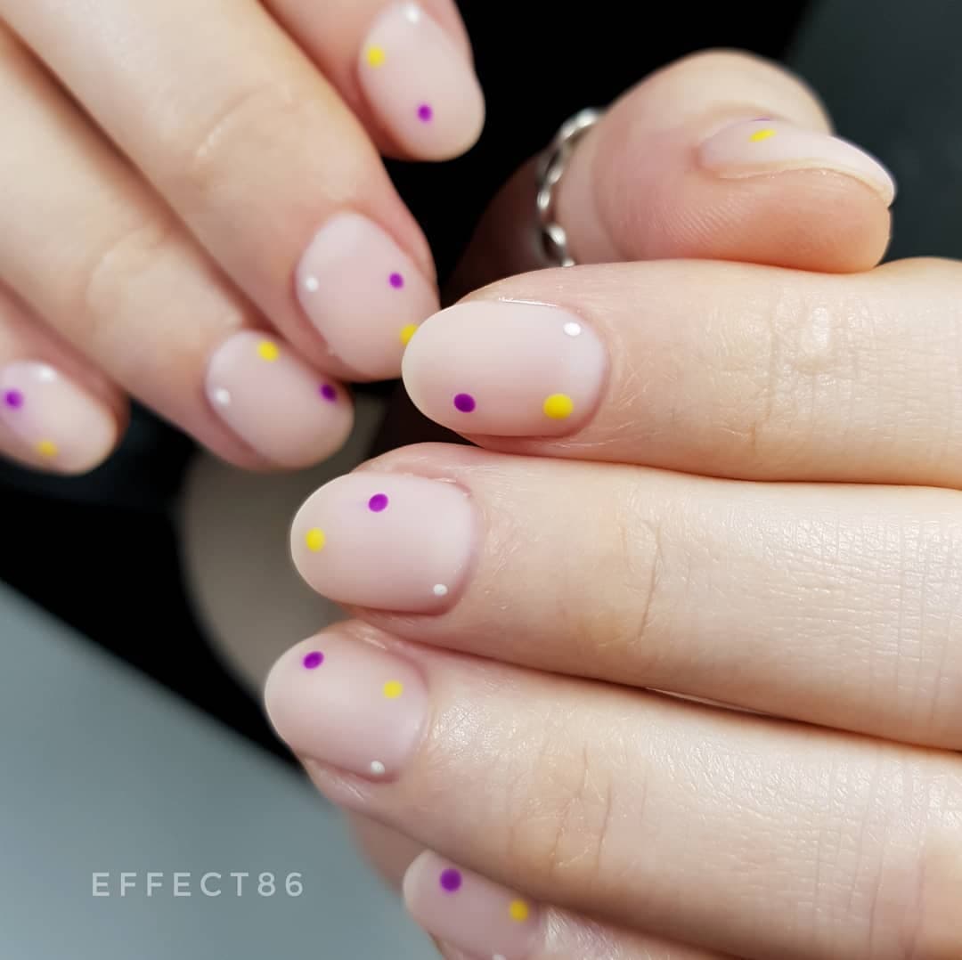 В 2023 годах такой дизайн лучше всего смотрится на миндальной форме, а также с мягким коротким квадратом. Точки могут быть как большие, похожие на горошек, так и совсем маленькие, напоминающие брызги кистью. Серебряный, белый и другие светлые цвета помогут создать более “конфетный” эффект, в то время как темные точки, наоборот, сделают розовые ногти более сдержанными и дерзкими.