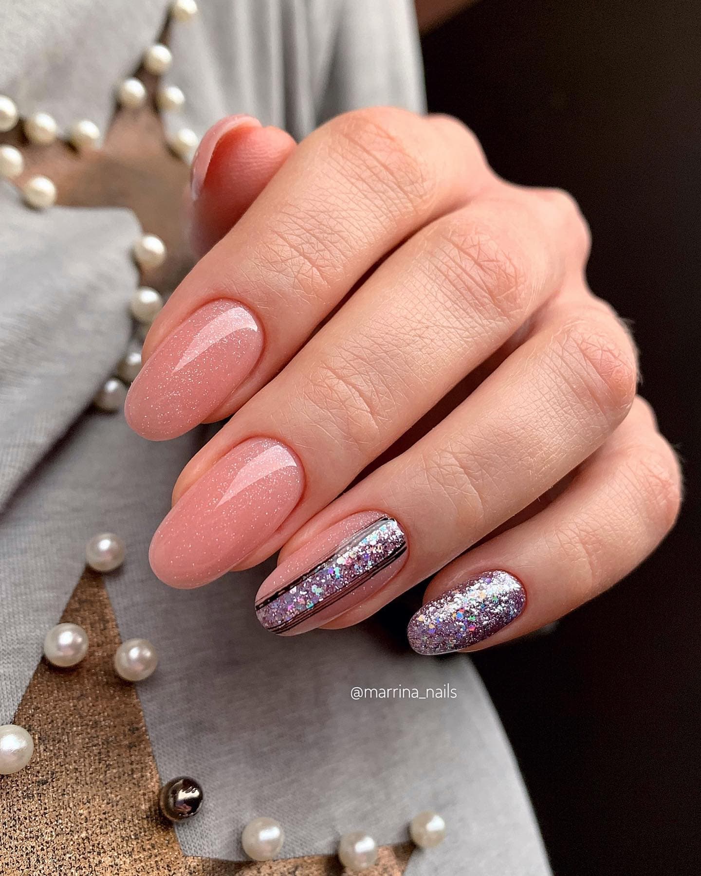 #1 Однотонный нюдовый маникюр с блестками