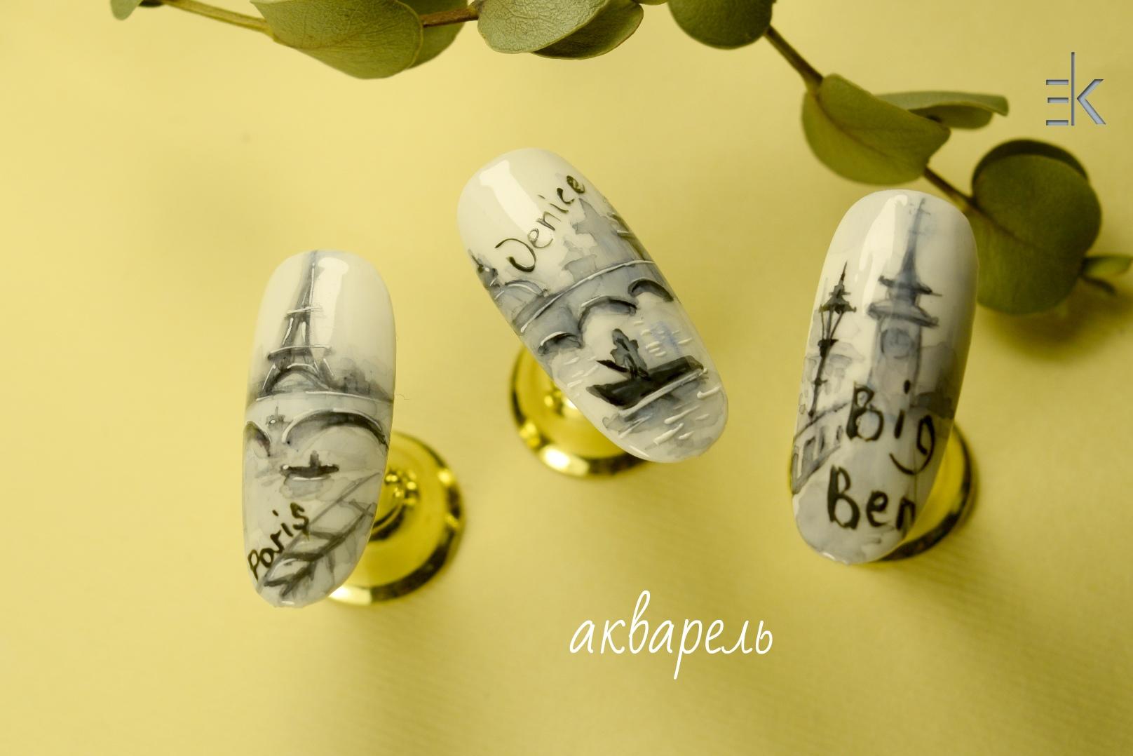 При рисовании акварелью используйте основные тона. Ведь сама фактура и техника акварели требует особых усилий. Сначала необходимо сделать маникюр (удалить кутикулы и придать ногтям правильную форму). Затем стоит удалить верхний глянец с ногтевой пластины. Затем следует покрыть основание ногтя, покрыть лаком и укрепить топ.